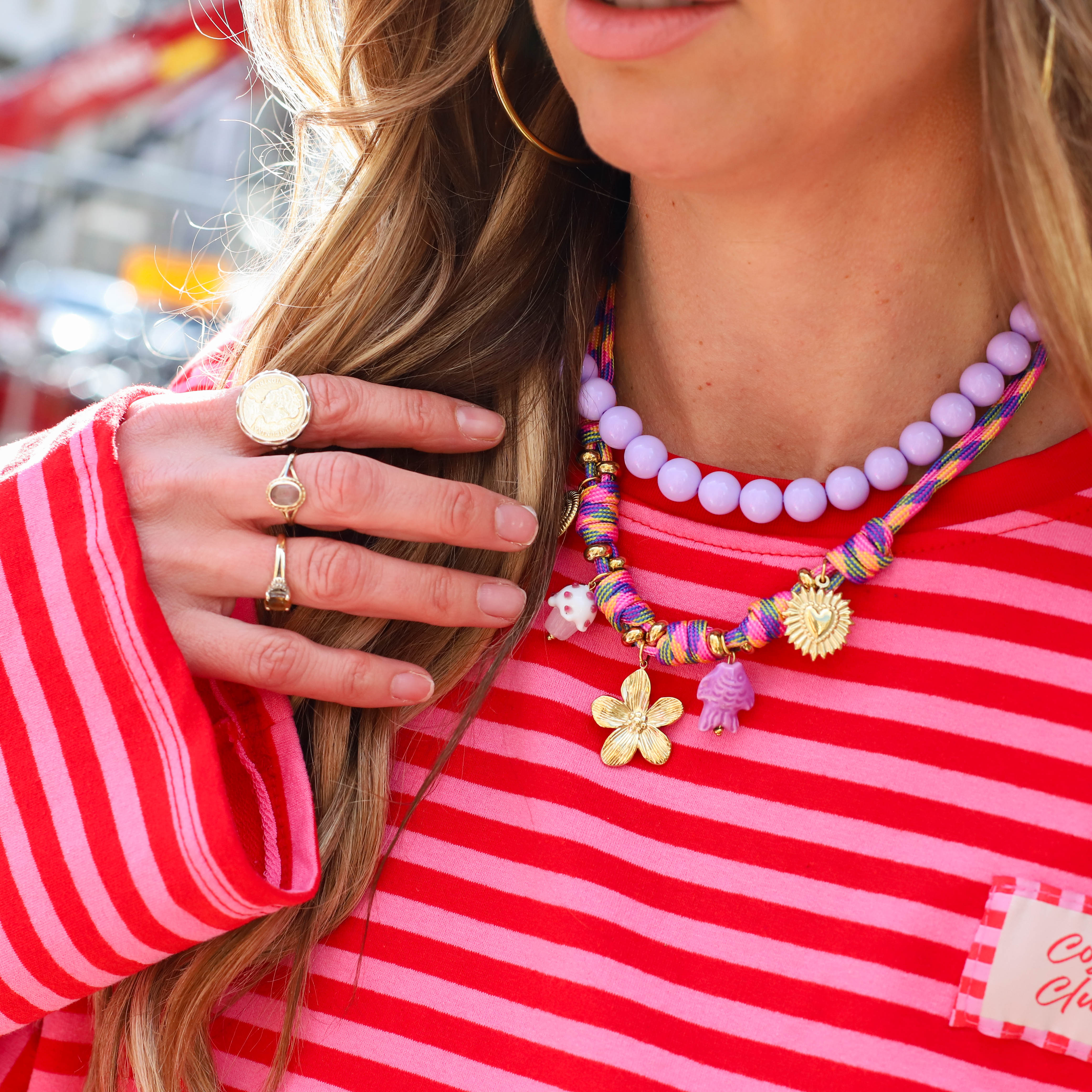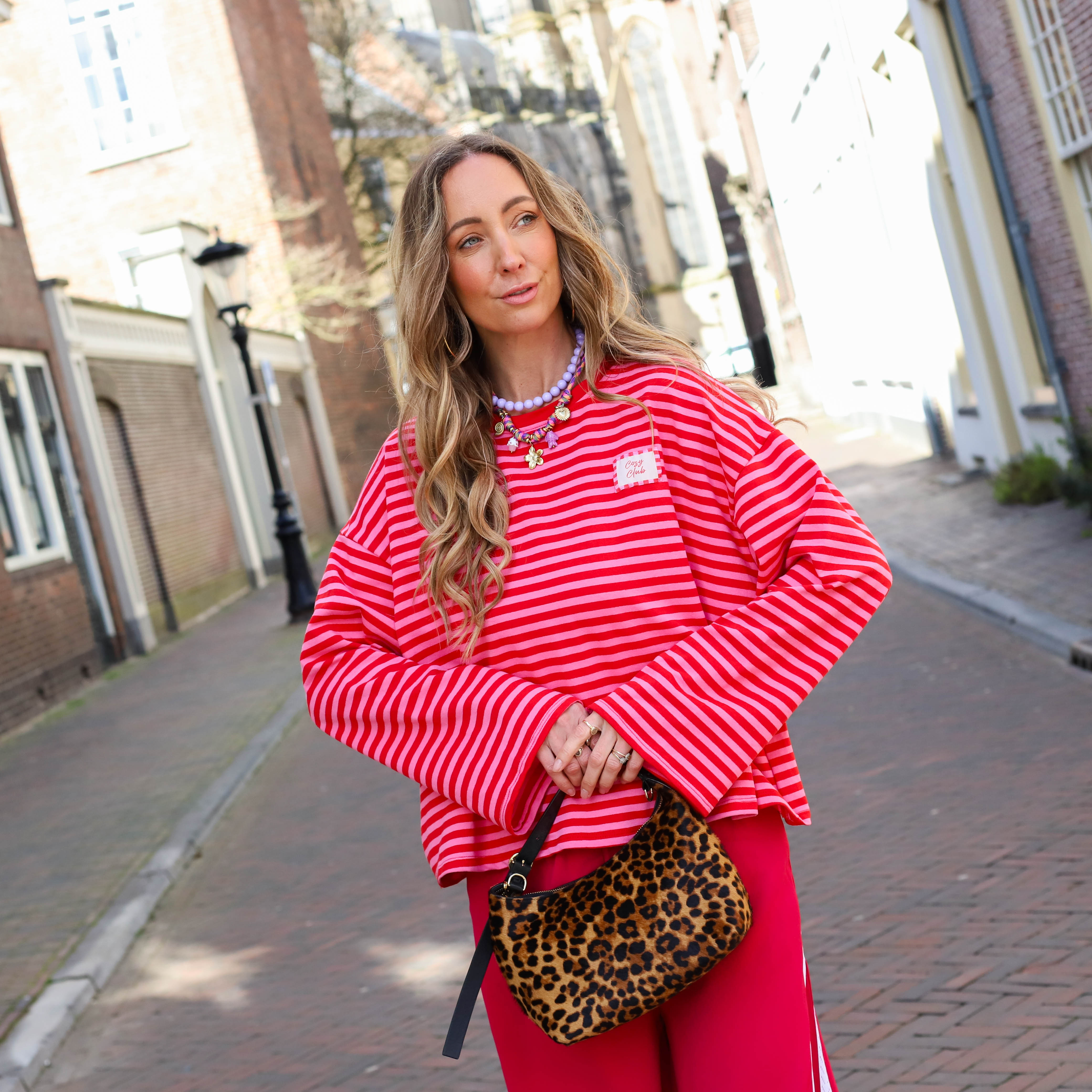 Deze Streep Top in roze en rood is een vrolijke eyecatcher. Het shirt heeft een speels streeppatroon, een subtiel 'Cozy Club' embleem en een nonchalante, oversized pasvorm. De zachte katoenmix draagt luchtig en comfortabel; een perfect item voor een frisse, energieke outfit.
