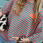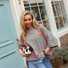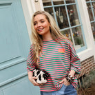 Dit gestreepte T-shirt is een opvallend en speels item met een frisse en kleurrijke uitstraling. De combinatie van groen en roze strepen geeft het shirt een vrolijke en energieke look, terwijl de zachte stof zorgt voor een comfortabel draaggevoel. De “Bisous” patch op de borst voegt een speels en uniek detail toe.