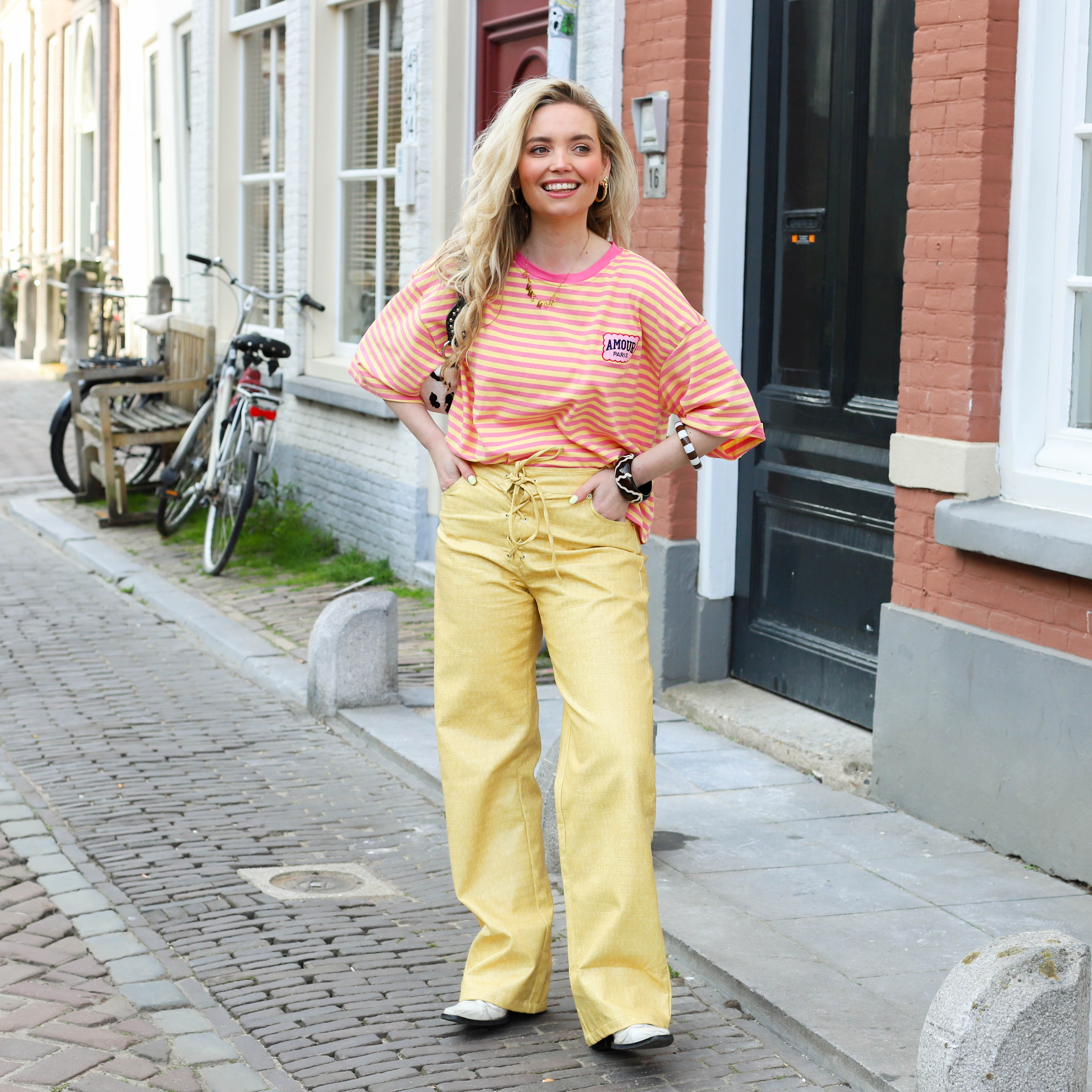 Dit gestreepte T-shirt is een vrolijk en opvallend item met een speelse en zomerse uitstraling. De combinatie van de gekleurde strepen zorgt voor een frisse en energieke look, terwijl de zachte stof comfortabel aanvoelt op de huid. De “Amour Paris” patch op de borst geeft het shirt een charmant en uniek detail.