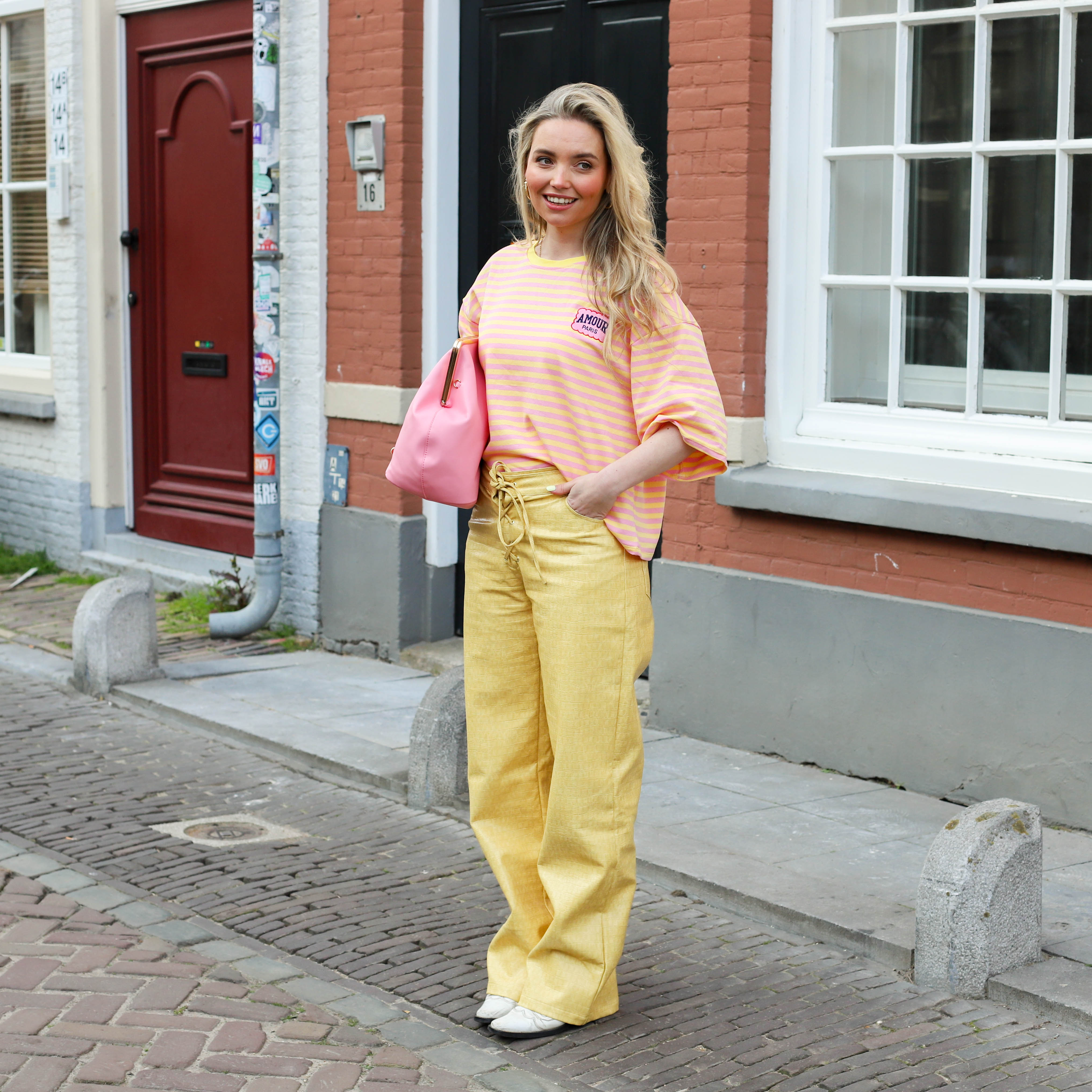 Korte mouw amour top geel roze