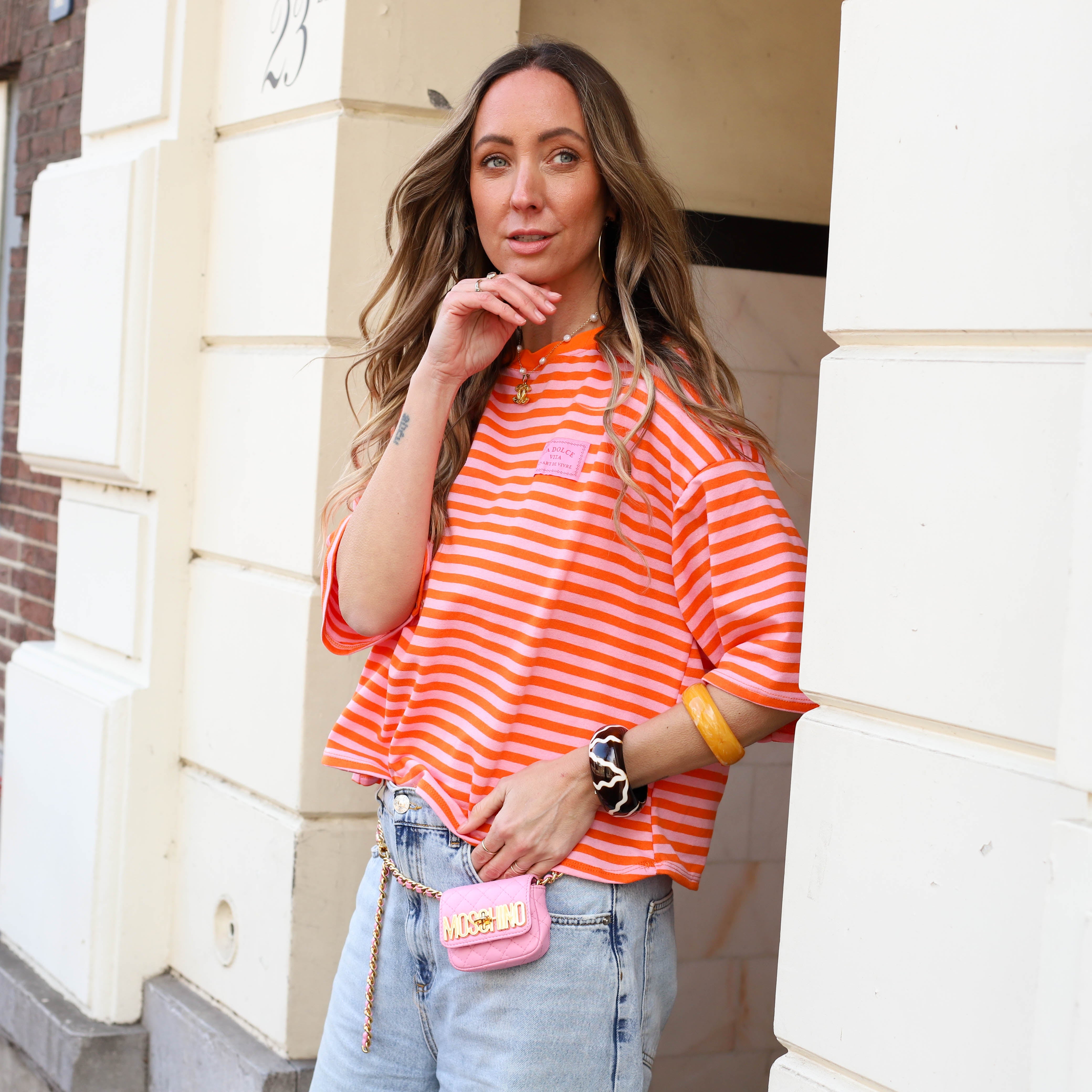 Geef je outfit een kleurrijke boost met dit gestreepte T-shirt. Het item valt op door het fijne streeppatroon en is voorzien van een subtiel "La Dolce Vita" embleem op de borst voor een speelse touch. De top heeft een comfortabele, oversized pasvorm met verlaagde schoudernaden en halflange mouwen. Combineer met een leuke jeans.