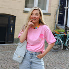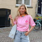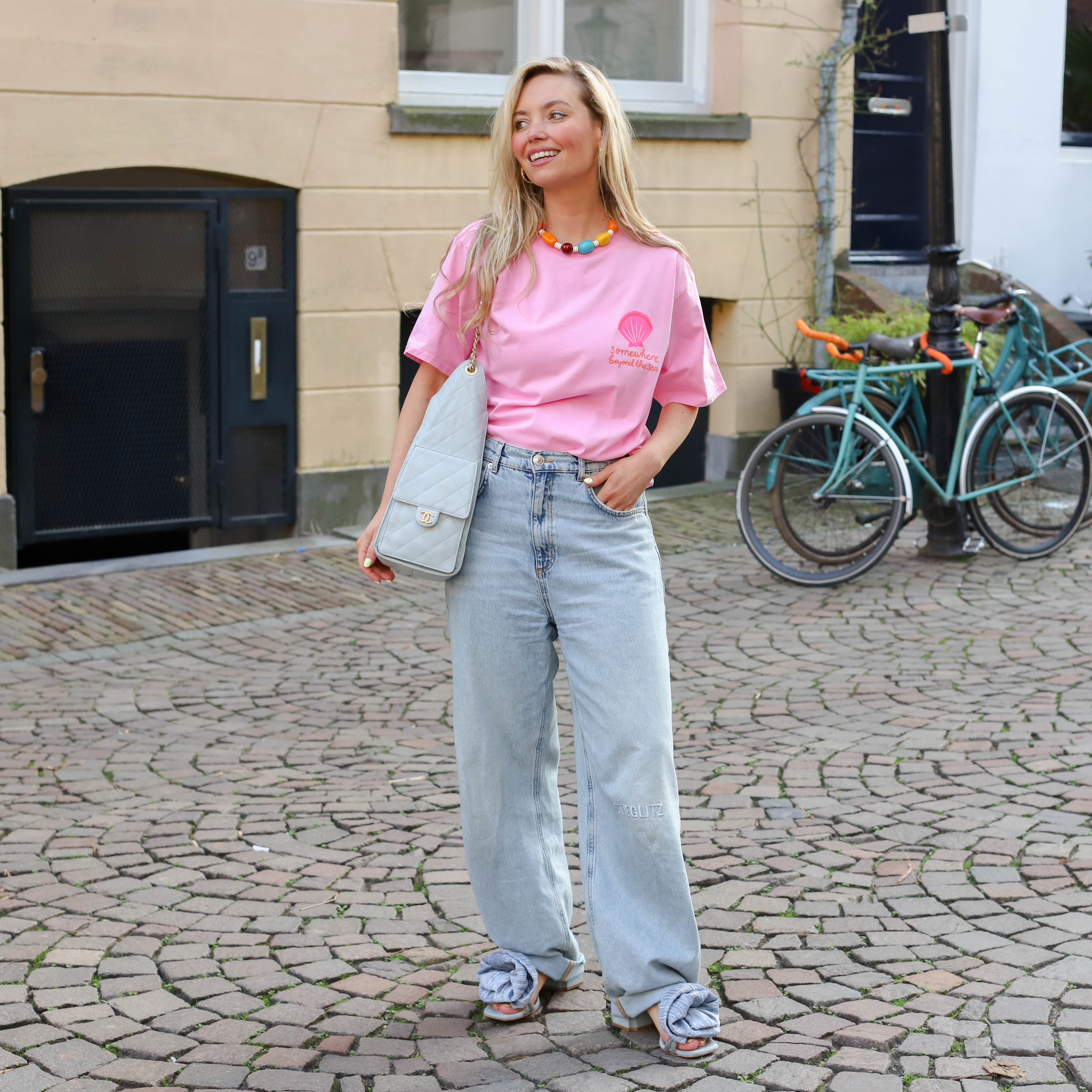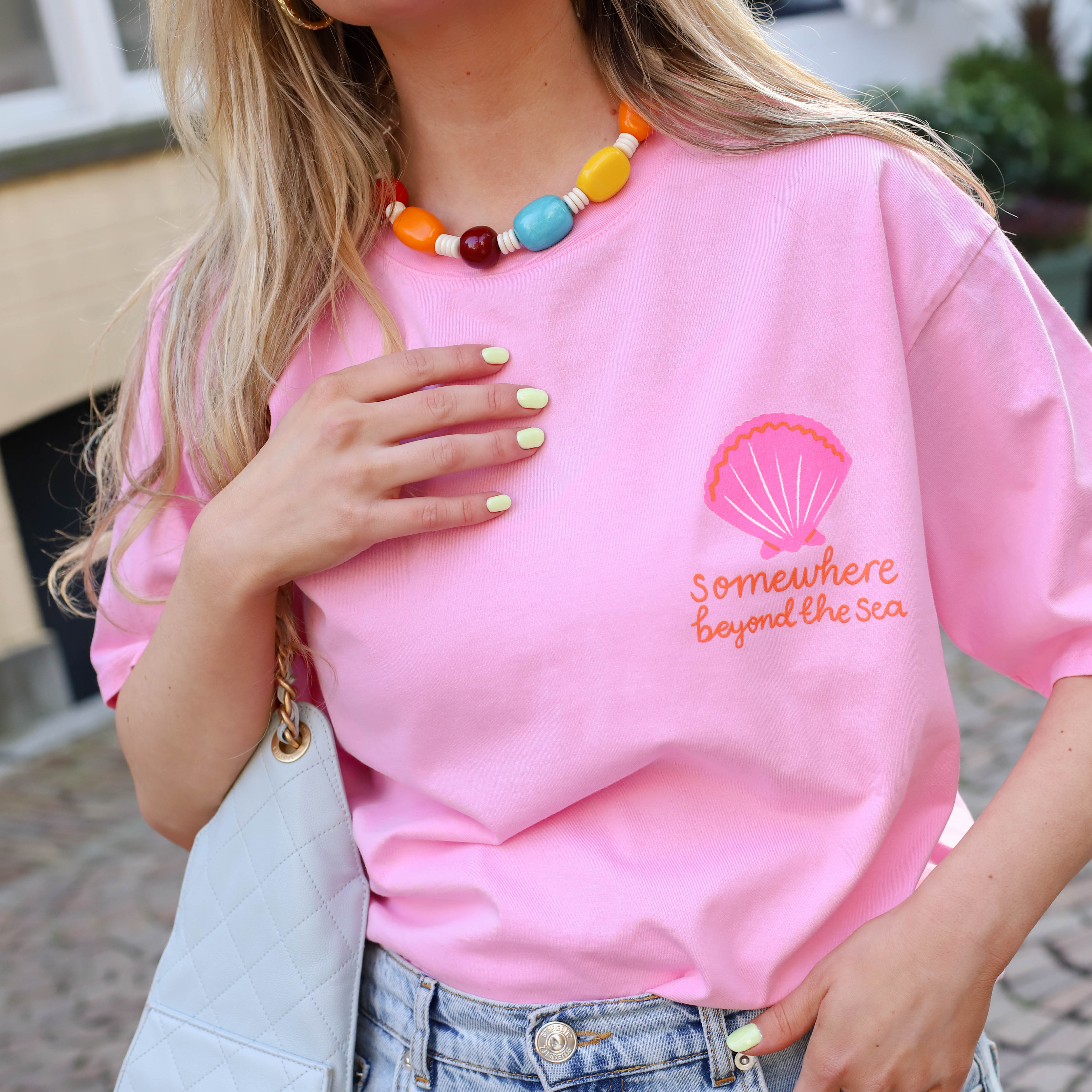 Dit comfortabele T-shirt heeft een nonchalante, oversized pasvorm en is voorzien van een ronde hals. Op de borst prijkt een vrolijke, grafische print van een roze schelp met de tekst "somewhere beyond the sea". Het shirt is gemaakt van 100% katoen, wat zorgt voor een ademend en zacht gevoel op de huid.