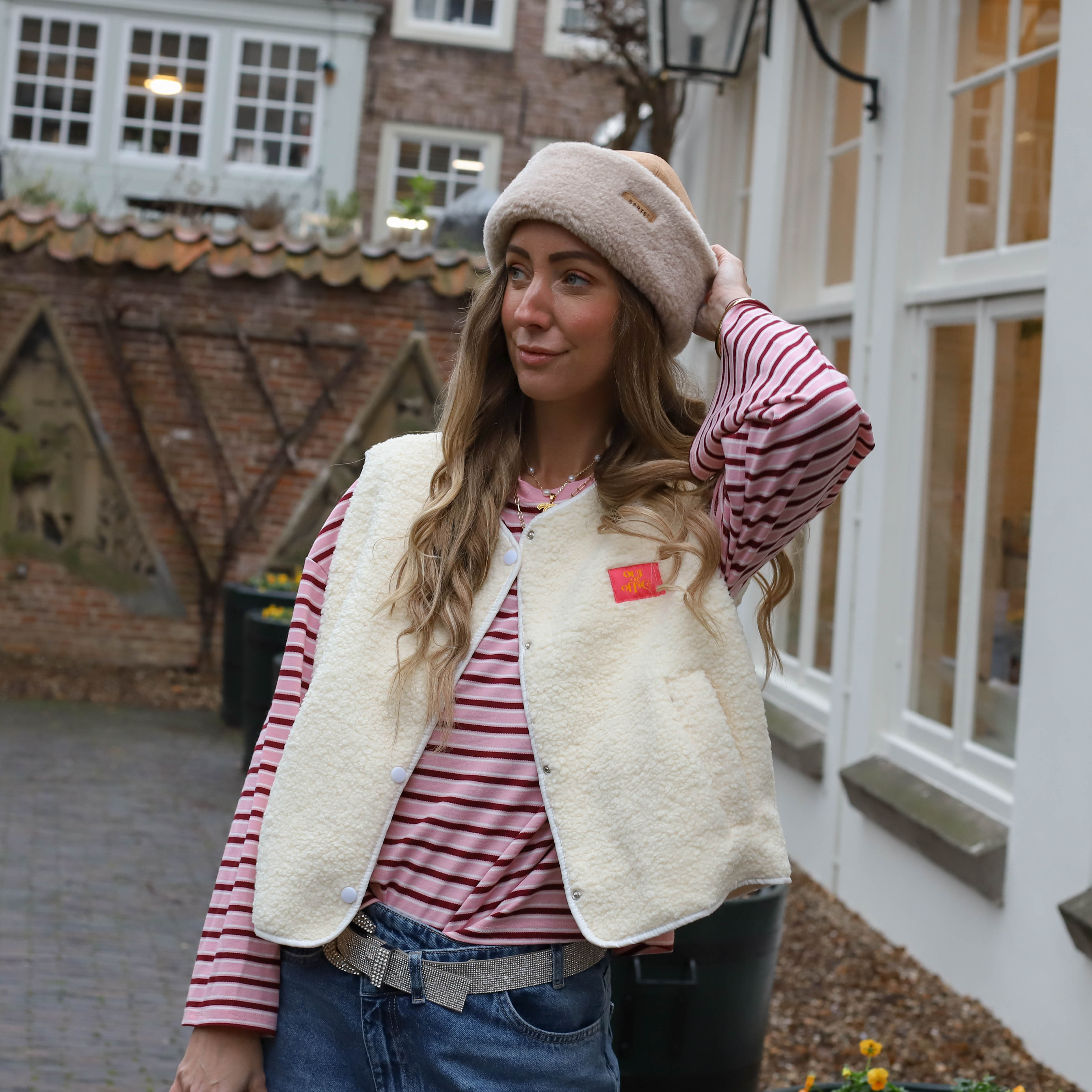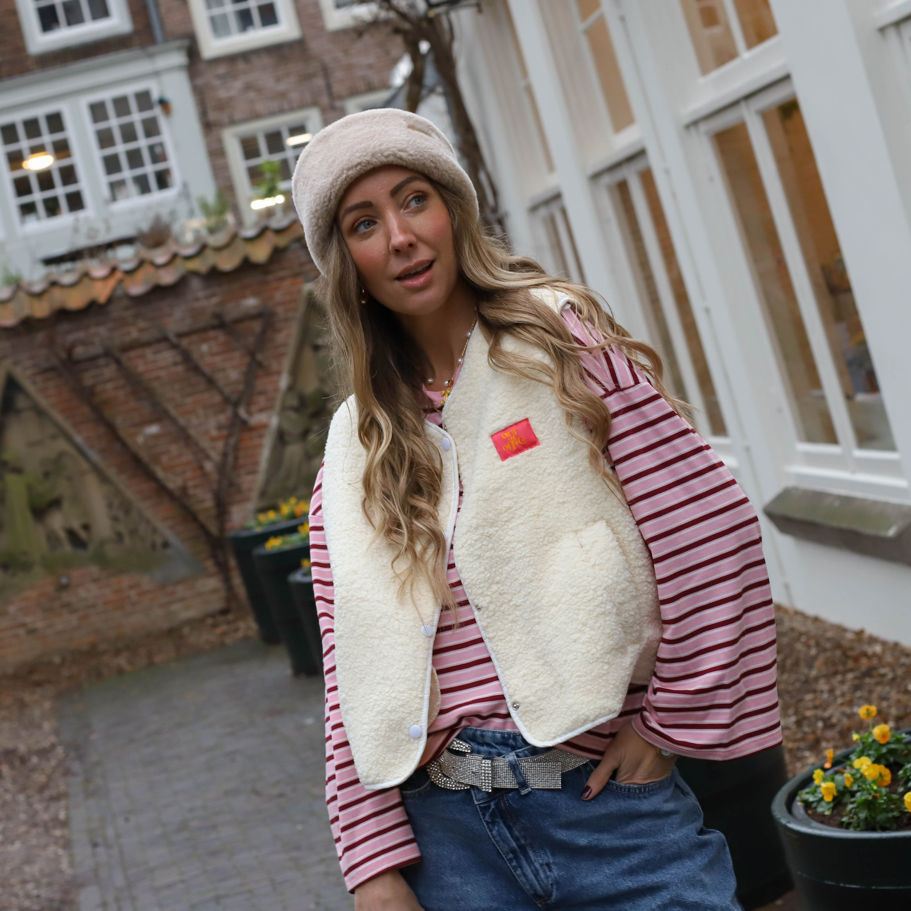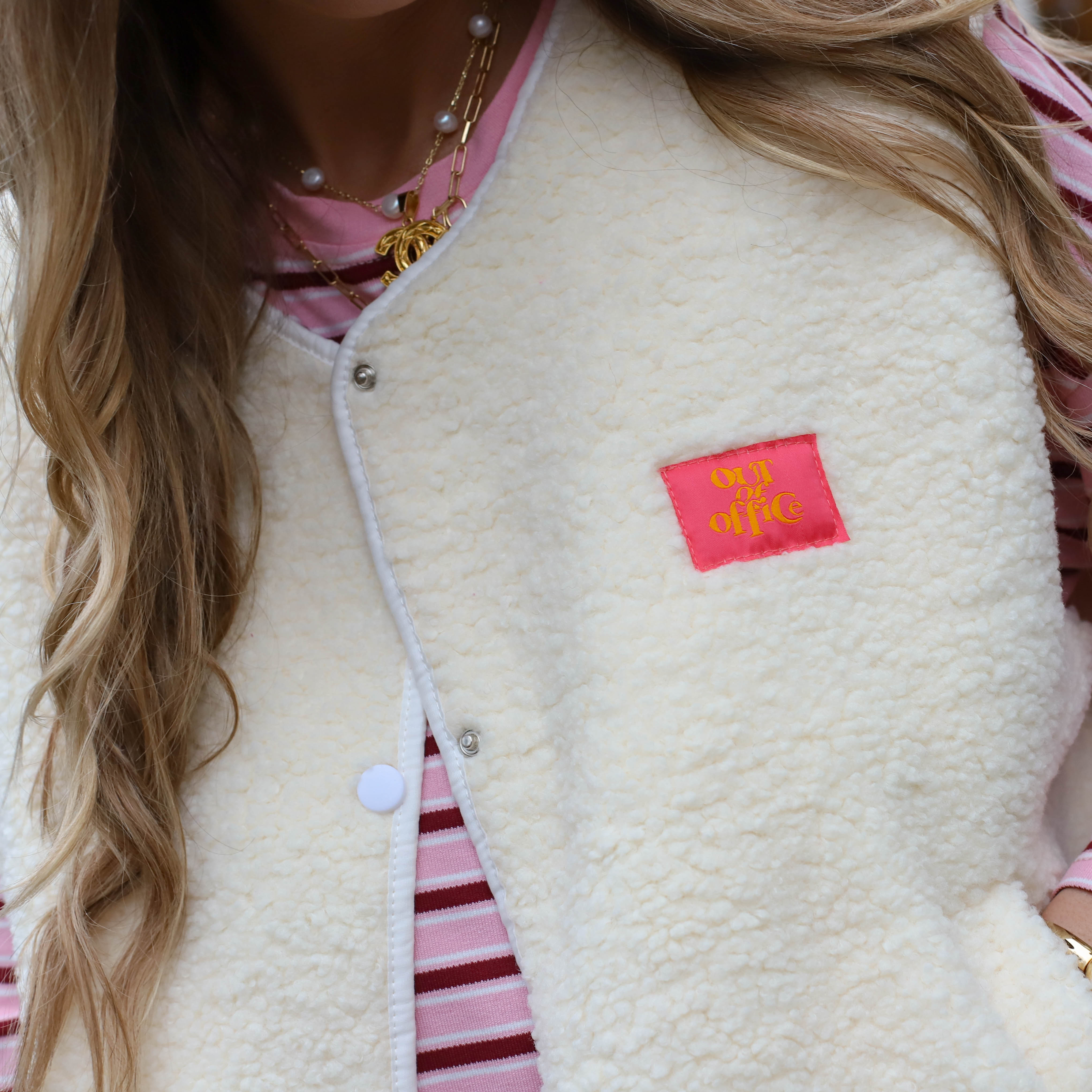 Deze Out of Office Teddy Bodywarmer is een trendy item, perfect om een warme textuur en een speels detail aan je outfit toe te voegen. De bodywarmer is gemaakt van zachte teddy fleece in een veelzijdige ecru tint en is voorzien van een opvallende rode "Out of Office" patch op de borst. De drukknoopsluiting, de subtiele V-hals en de steekzakken maken dit een ideaal gelaagd item voor een comfortabele en fashionable look.