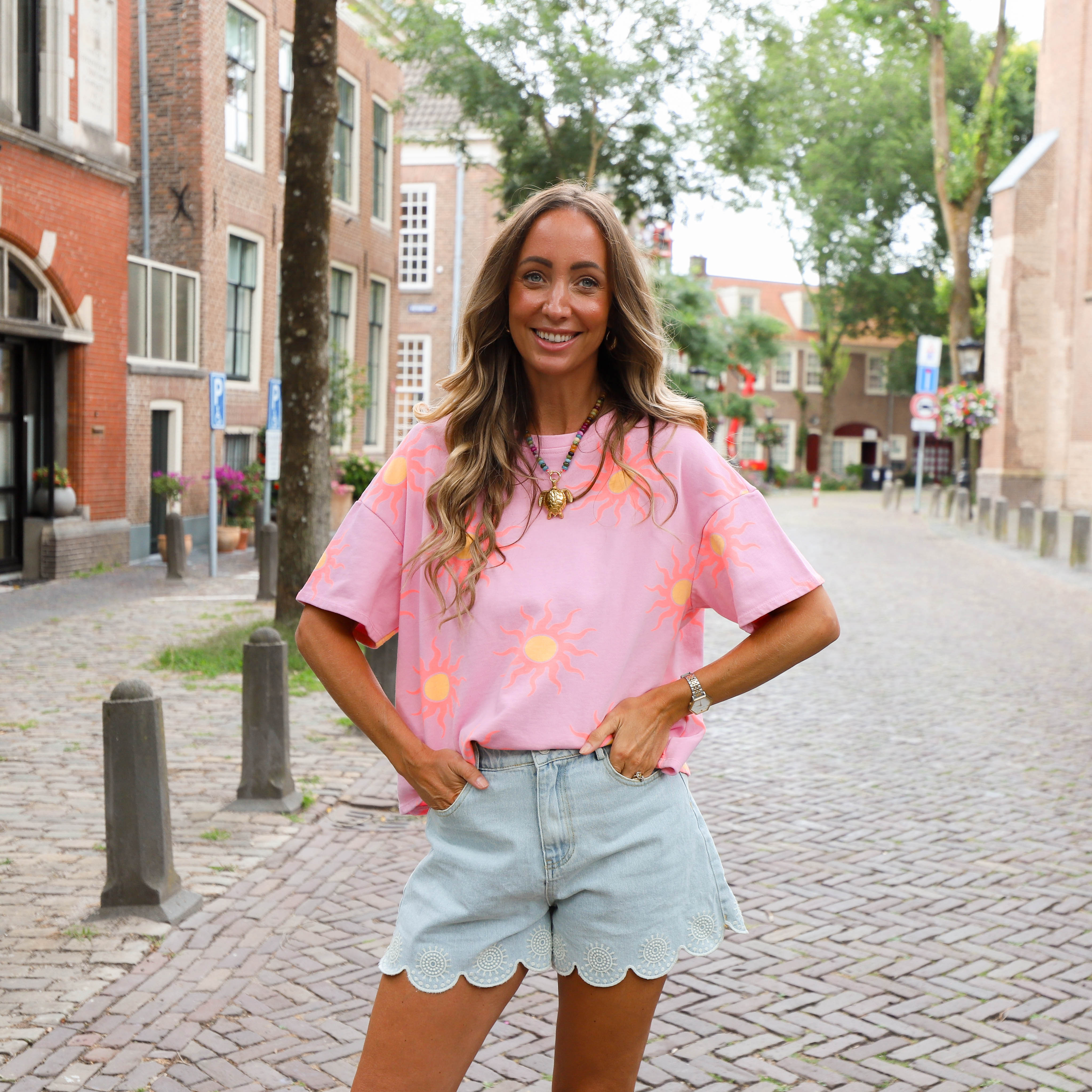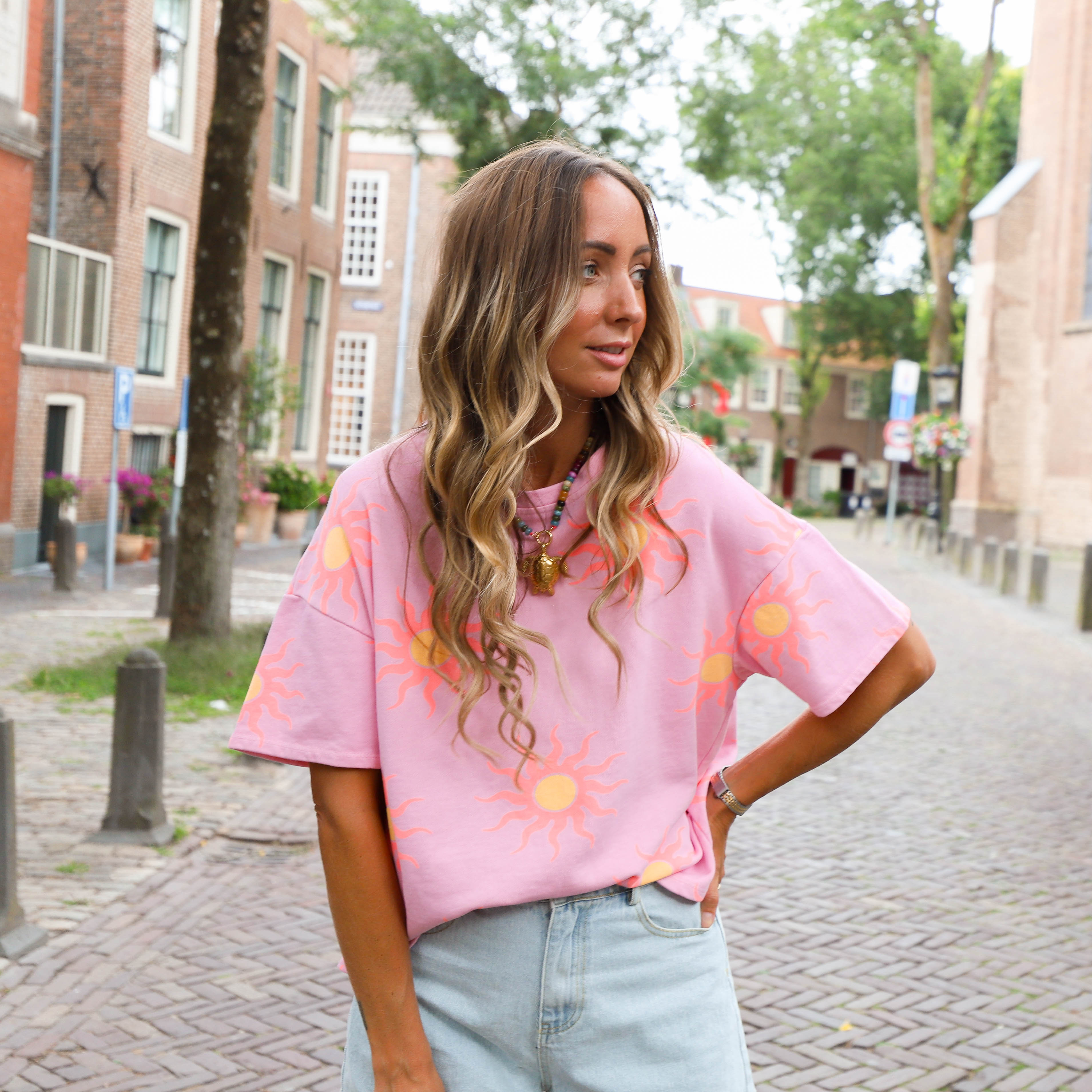 Dit zonnige T-shirt in een zachte roze oranje kleur is een echte blikvanger. De shirt heeft een opvallende all-over print van zonnen in oranje en geel. Het shirt heeft een relaxte pasvorm met korte mouwen en een ronde halslijn.