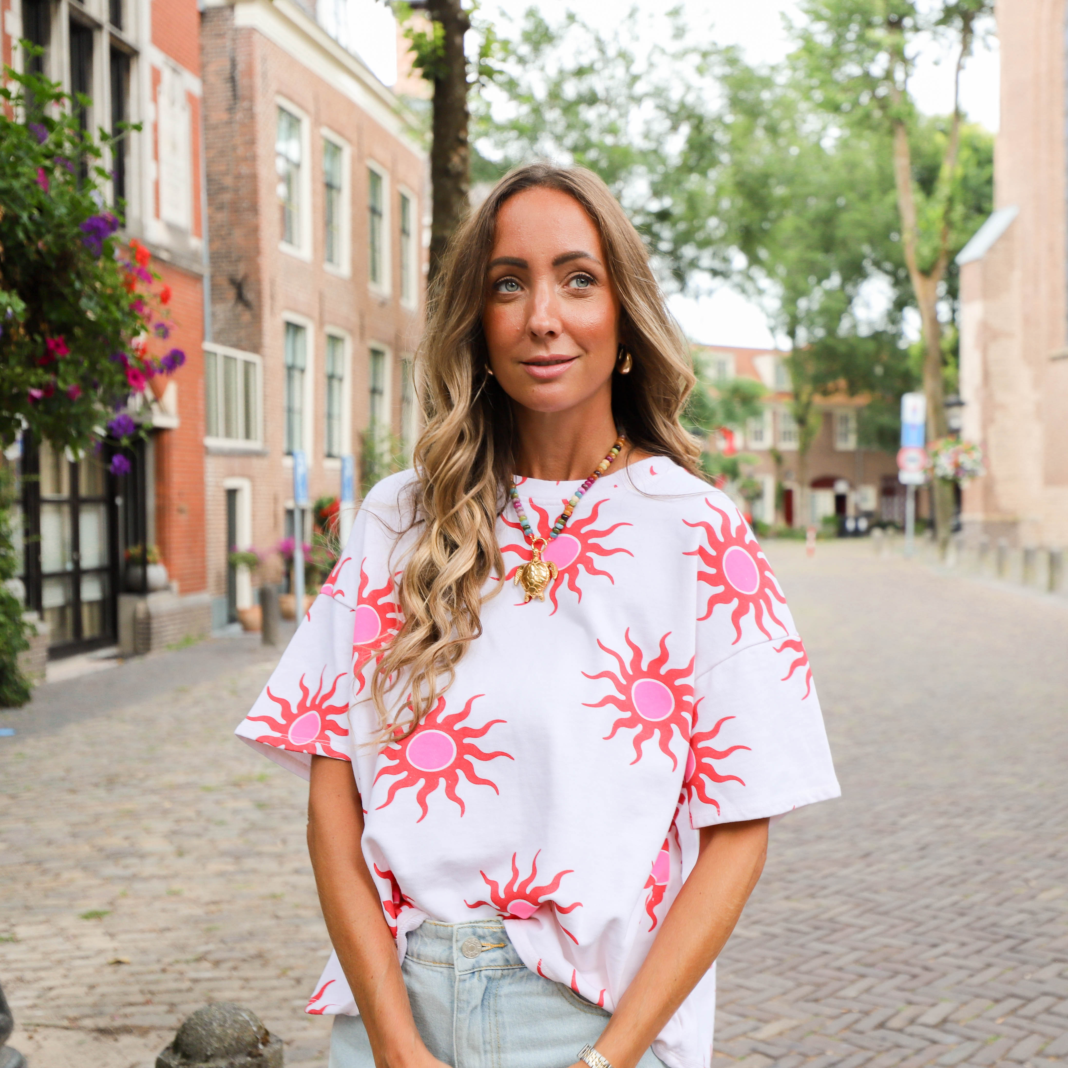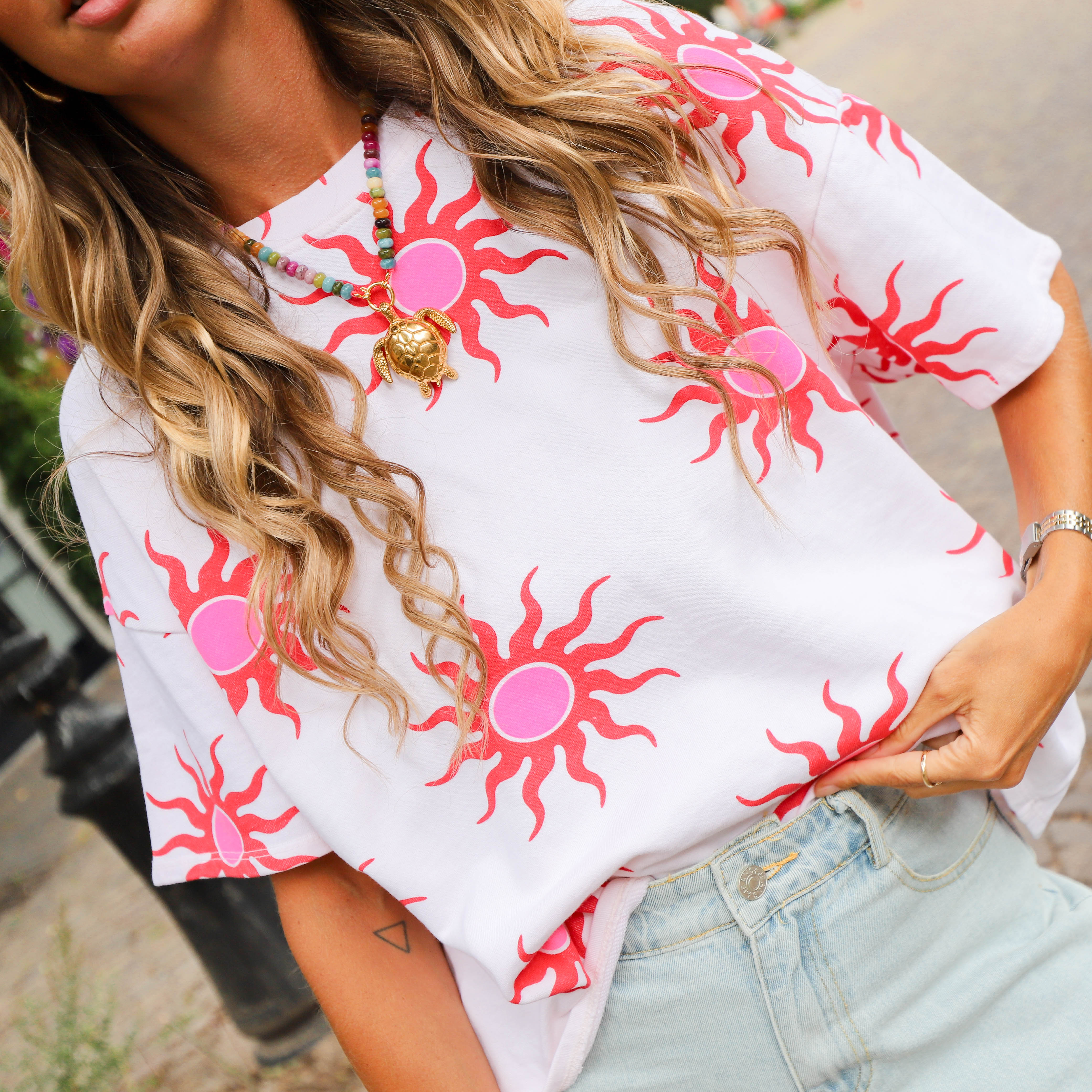 Dit zonnige T-shirt in een zachte wit rode kleur is een echte blikvanger. De shirt heeft een opvallende all-over print van zonnen in oranje en geel. Het shirt heeft een relaxte pasvorm met korte mouwen en een ronde halslijn.