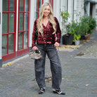 De top heeft een flatterend wikkelmodel dat in de taille gestrikt wordt, waardoor een mooie V-hals en een getailleerd silhouet ontstaat. De lange mouwen en de luxe uitstraling maken deze top perfect voor feestjes, avondjes uit of speciale gelegenheden.