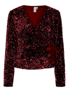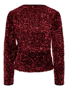 Deze Yabelle LS Wrap Top is een glamoureuze en feestelijke toevoeging aan elke garderobe. De top is volledig bedekt met schitterende bordeauxrode pailletten, wat zorgt voor een rijke en sprankelende uitstraling.