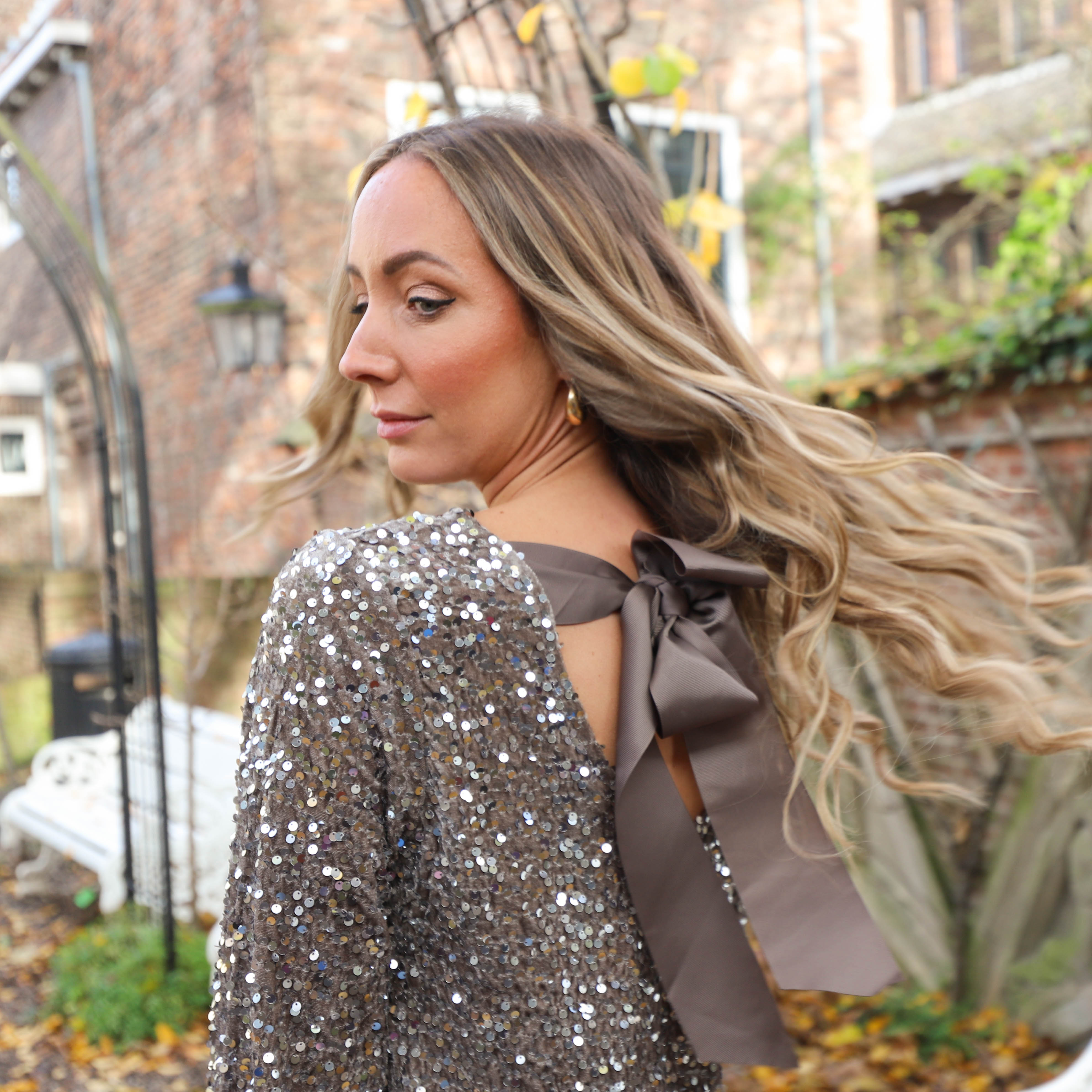 Mooie zwarte jurk met pailletten. De jurk heeft een A-lijn en lange mouwen. Perfect voor de feestdagen!