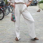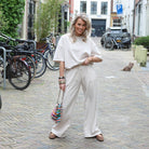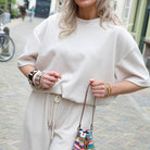Comfortabele en stijlvolle jogging set in een zachte beige kleur. De set bestaat uit een losvallende top met korte mouwen en een bijpassende broek, perfect voor een relaxte maar trendy look.