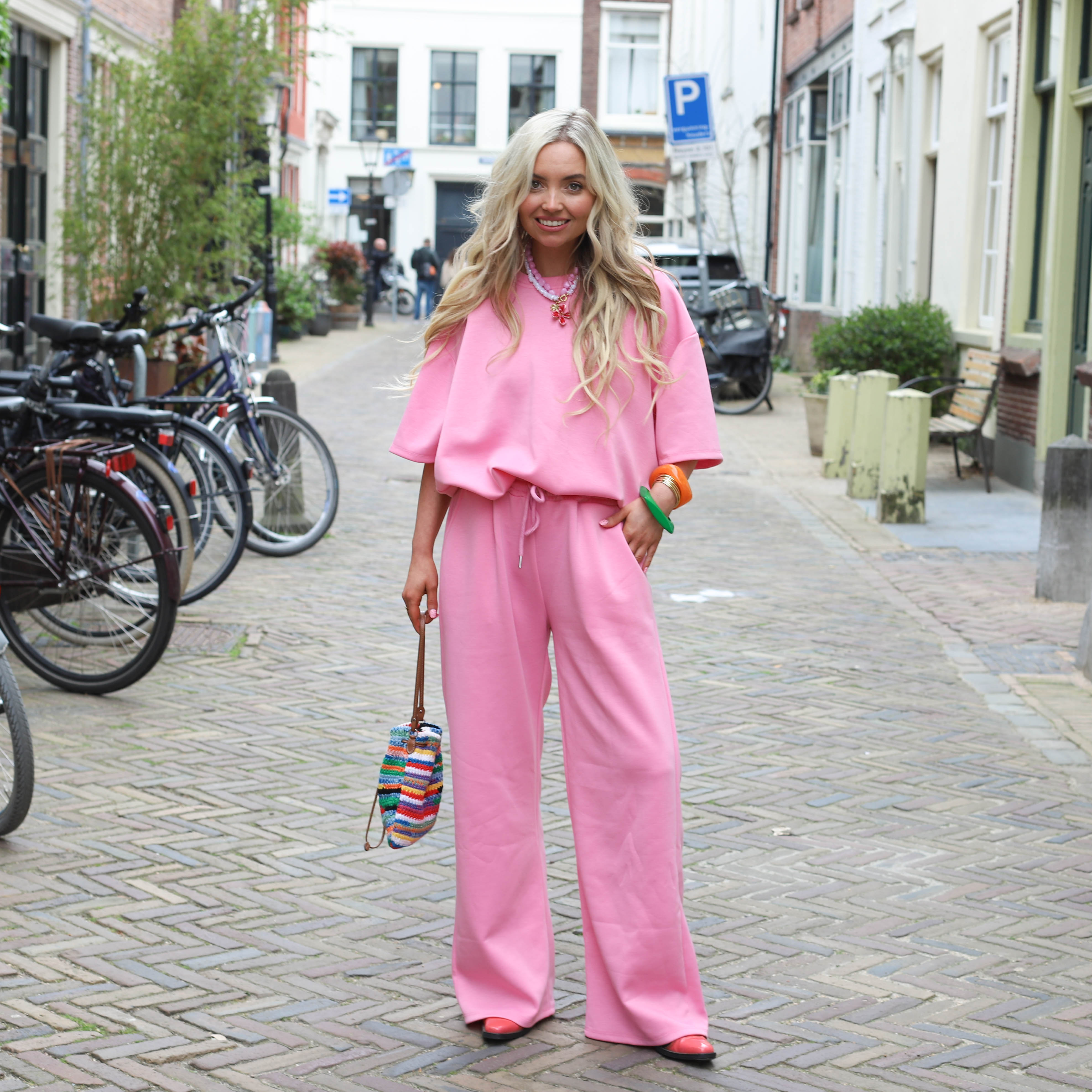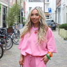 Comfortabele en stijlvolle jogging set in een zachte roze kleur. De set bestaat uit een losvallende top met korte mouwen en een bijpassende broek, perfect voor een relaxte maar trendy look.
