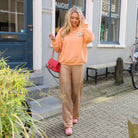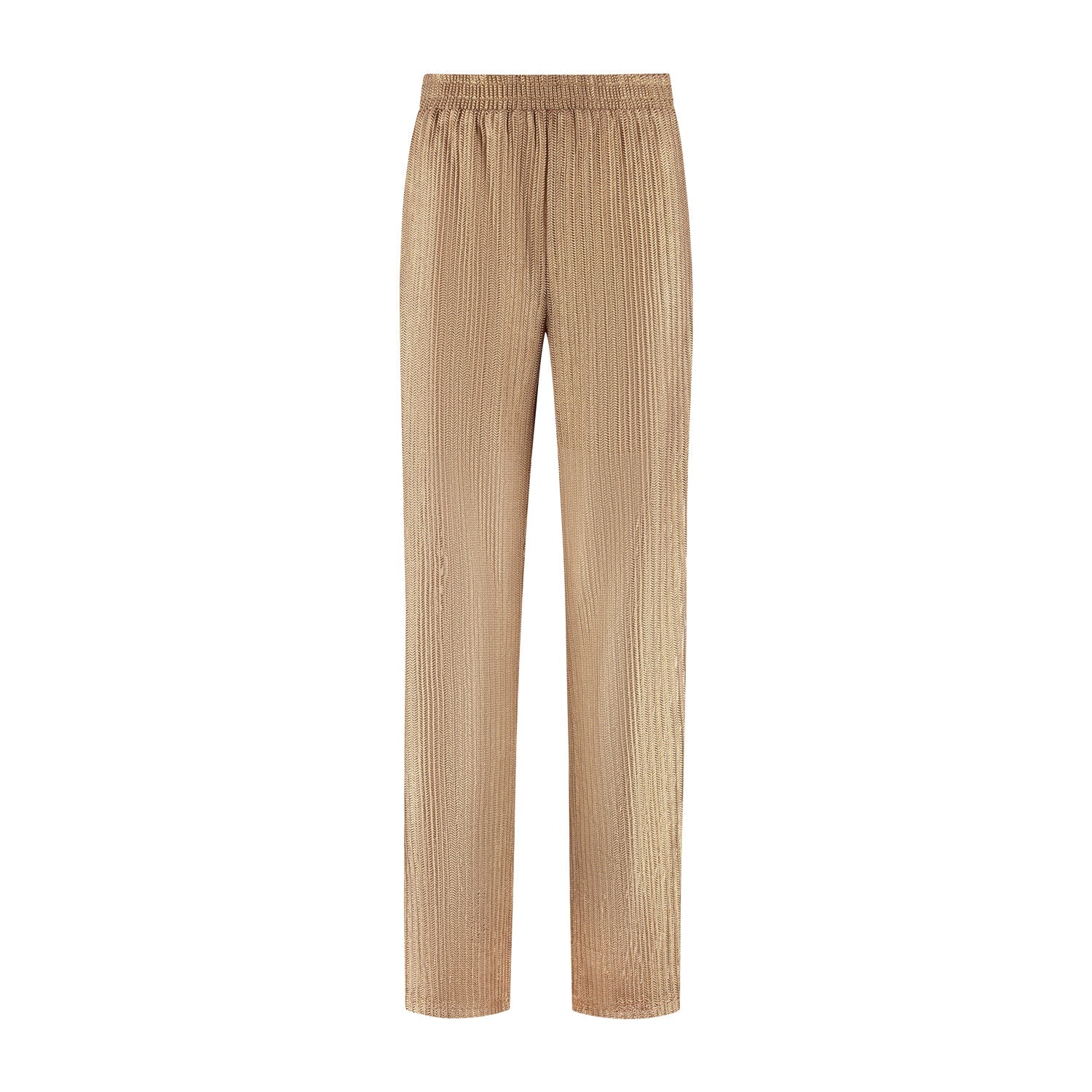 De Fiene broek is een elegante, goudkleurige broek met een comfortabele pasvorm. Dankzij de elastische band aan de achterkant sluit de broek perfect aan en biedt hij extra bewegingsvrijheid. Combineer met de Evi top voor een complete, stijlvolle look.