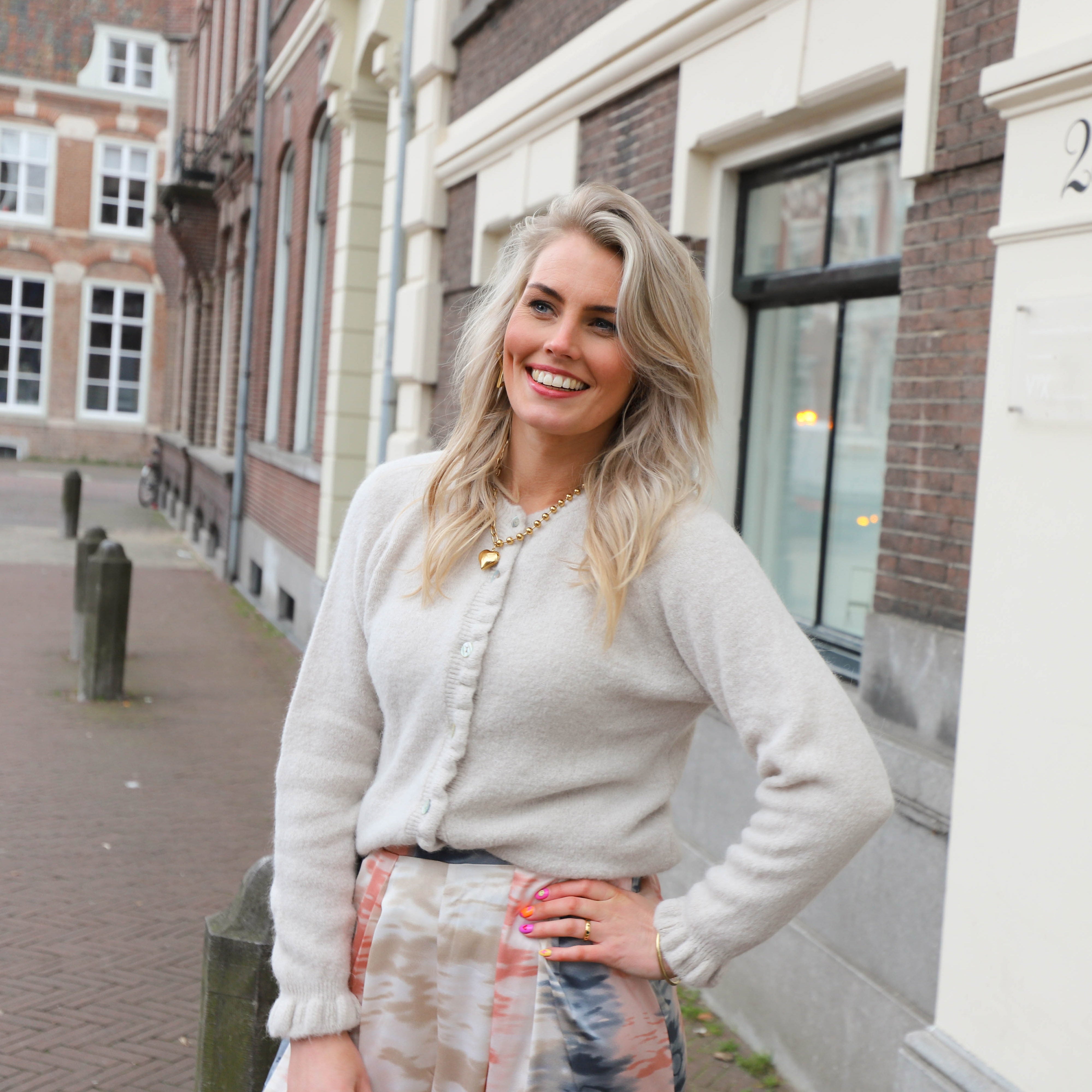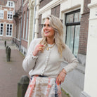 Deze zachte ecru cardigan is een must-have voor je lentegarderobe. De ruffles aan de mouwen en zoom geven de cardigan een speelse touch. Combineer met een roze jeans.