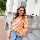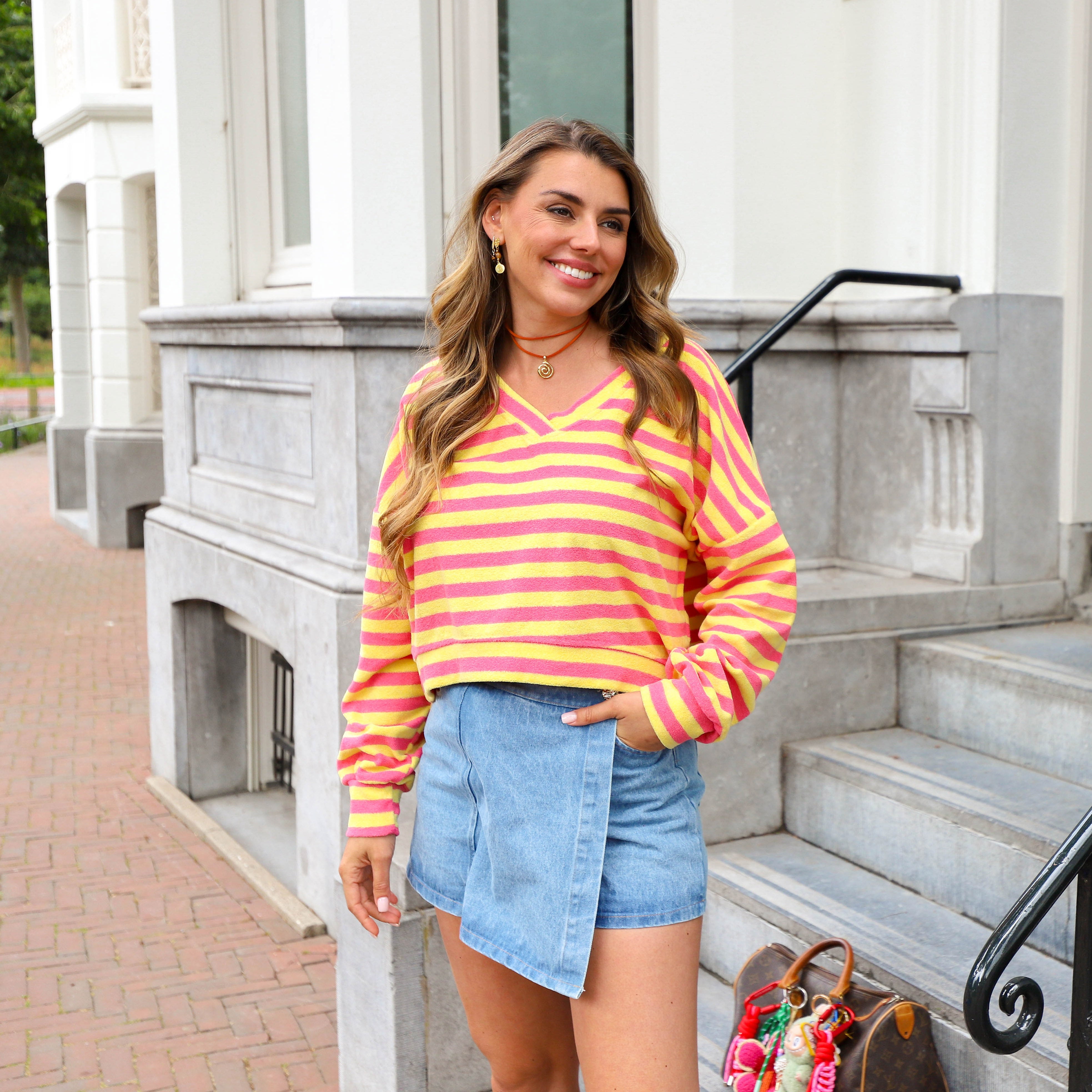 De sweater heeft strepen helder geel en zacht roze, waardoor een frisse en zomerse uitstraling ontstaat. Combineer met een broekrokje!