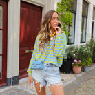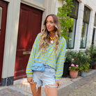 Deze vrolijke crop top is gemaakt van zachte badstof en heeft een opvallend gestreept patroon in lichtblauw en neongeel. Het model op de foto is 178 cm lang en draagt de top in 'one size', wat wijst op een losvallende pasvorm die comfortabel zit. De top heeft lange mouwen en een ronde hals, perfect voor een casual maar stijlvolle look.