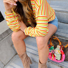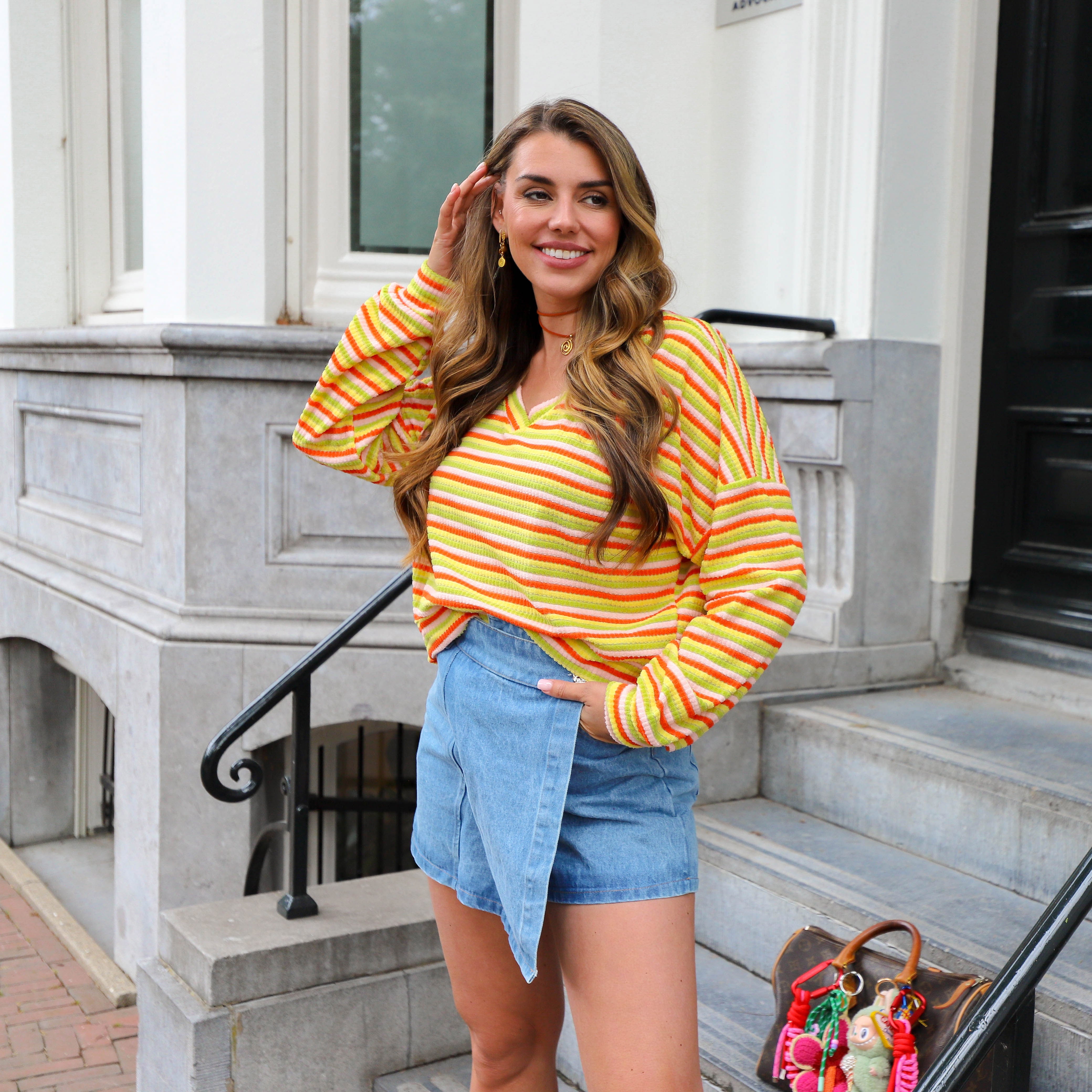 De sweater heeft een mooi gestreept patroon met een mix van vrolijke kleuren zoals geel, oranje en een vleugje lichtgroen. Leuk om te combineren met een broekrokje!