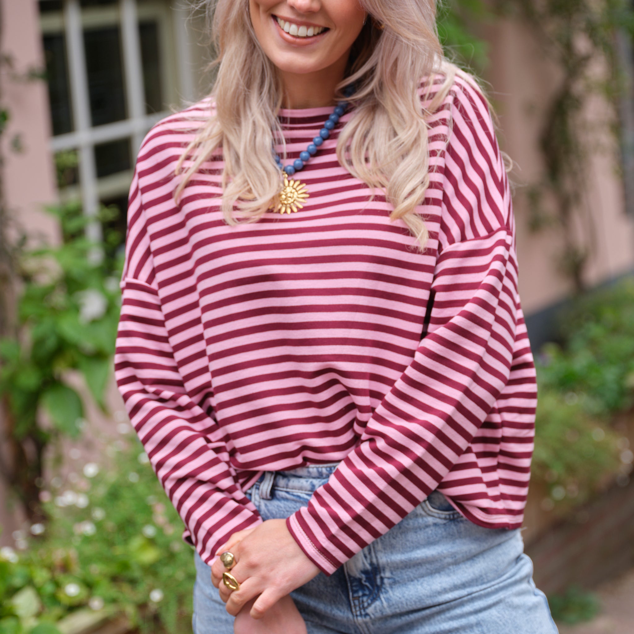 De Billy streep trui is een comfortabele en veelzijdige toevoeging aan je basisgarderobe. Deze trui heeft een klassiek, tijdloos streepdessin in een opvallende combinatie van diep bordeauxrood en zacht roze. De wijde, casual pasvorm met lange mouwen en een ronde hals zorgt voor een ontspannen en flatterende look. Dankzij de zachte katoenmix is deze trui heerlijk om te dragen. Combineer deze trui eenvoudig met een jeans of een leren broek voor een moeiteloos chique uitstraling.