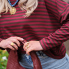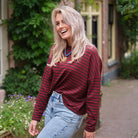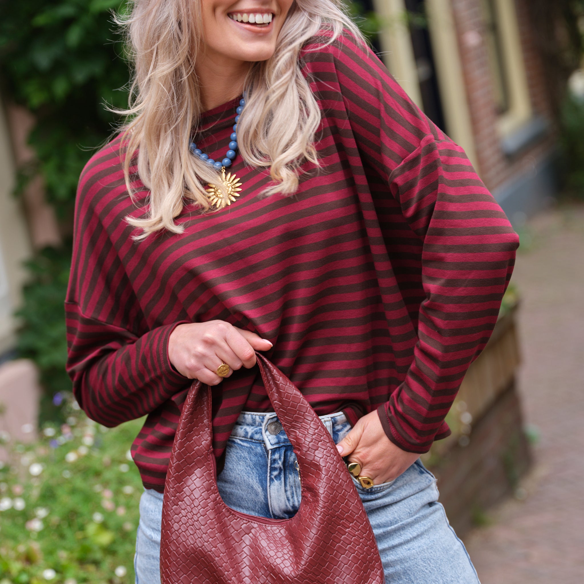 De Billy streep trui is een comfortabele en veelzijdige toevoeging aan je basisgarderobe. Deze trui heeft een klassiek, tijdloos streepdessin in een opvallende combinatie van diep burgundy en bruin. De wijde, casual pasvorm met lange mouwen en een ronde hals zorgt voor een ontspannen en flatterende look. Dankzij de zachte katoenmix is deze trui heerlijk om te dragen. Combineer deze trui eenvoudig met een jeans of een leren broek voor een moeiteloos chique uitstraling.