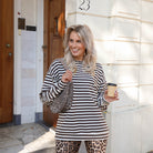 De Charlie Streep Sweater is een comfortabele en veelzijdige trui met een speels gestreept patroon in wit bruin. Deze sweater heeft een rechte, oversized pasvorm en een ronde hals. De lange mouwen en zachte stof geven het item een casual uitstraling, terwijl de fijne strepen zorgen voor een subtiele en vrolijke look.