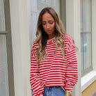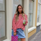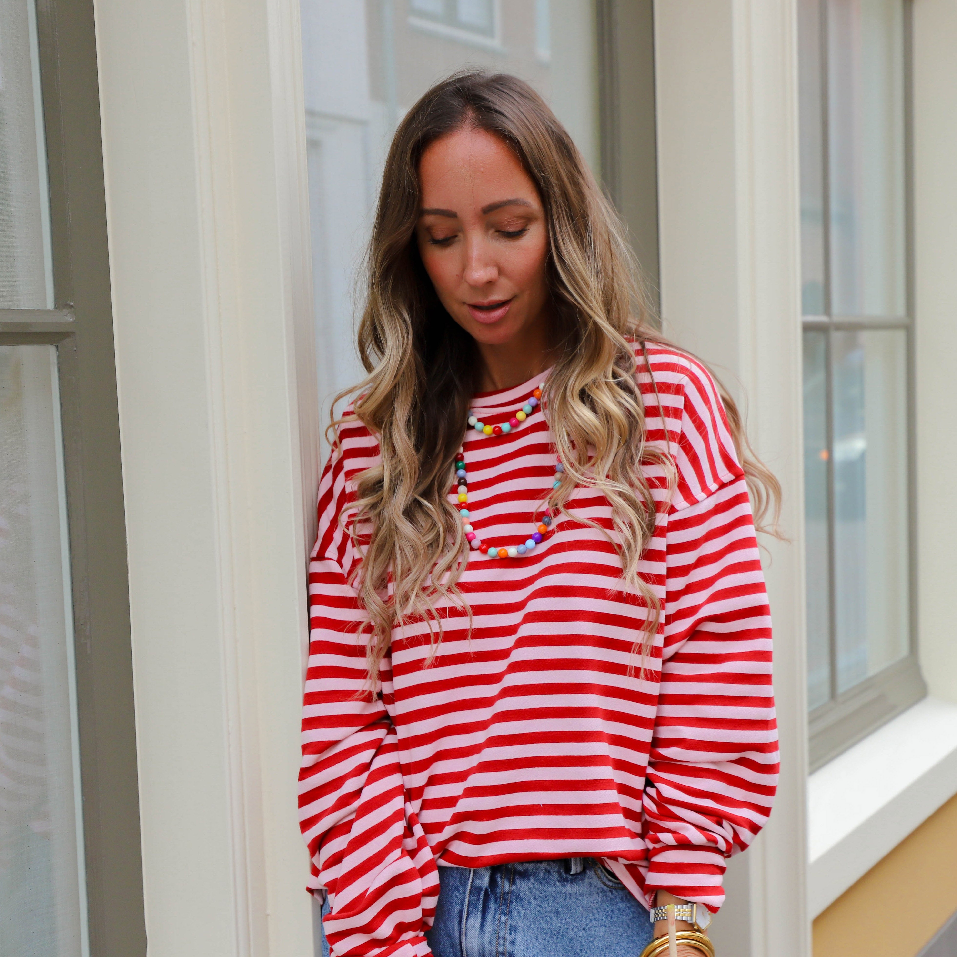 De Charlie Streep Sweater is een comfortabele en veelzijdige trui met een speels gestreept patroon in roze en rood. Deze sweater heeft een rechte, oversized pasvorm en een ronde hals. De lange mouwen en zachte stof geven het item een casual uitstraling, terwijl de fijne strepen zorgen voor een subtiele en vrolijke look.