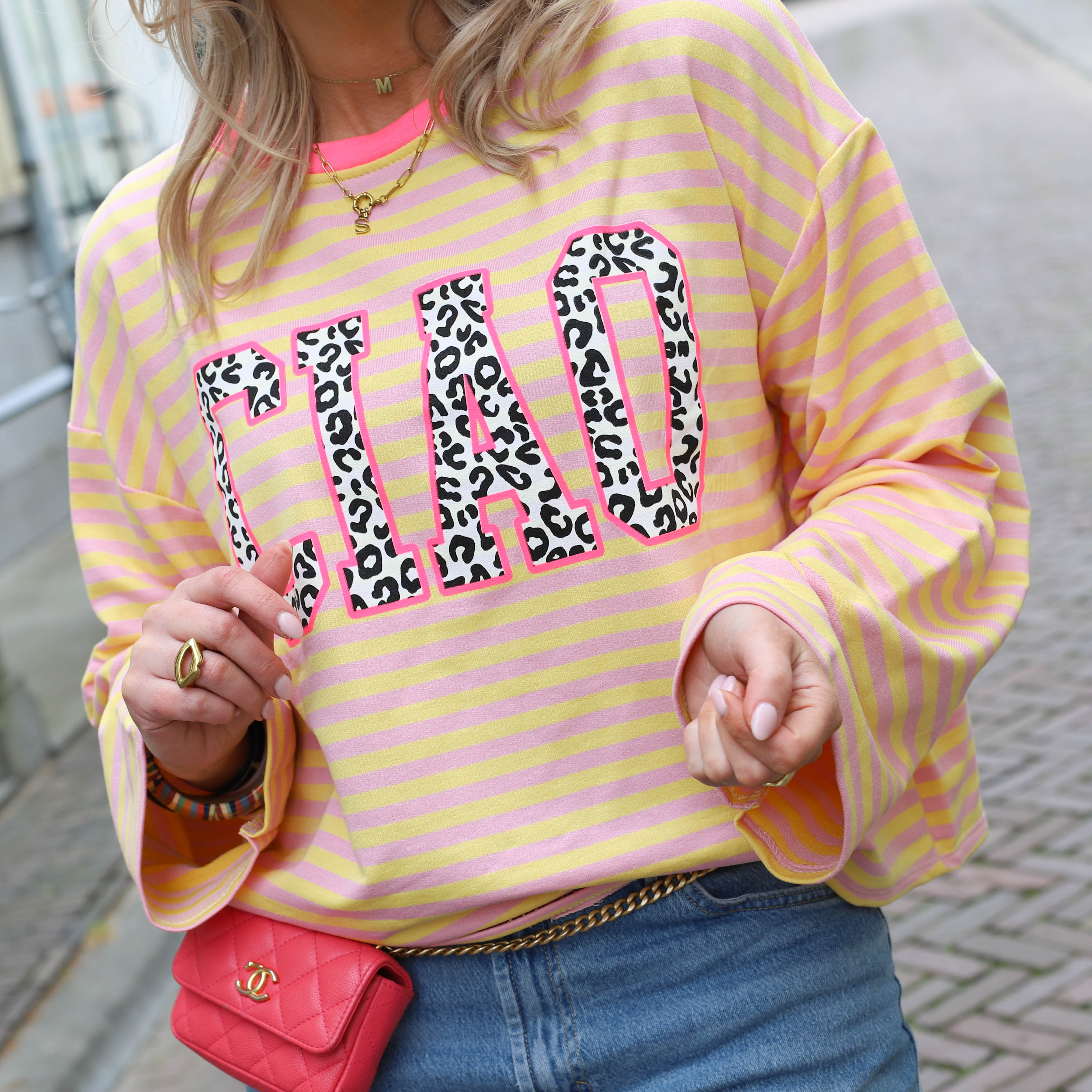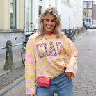 Opvallende sweater met een speelse streep en een trendy “CIAO”-print met dierenprint detail. De frisse roze kleur geeft je outfit direct een vrolijke en energieke uitstraling. Perfect voor een casual look met een statement.