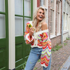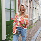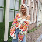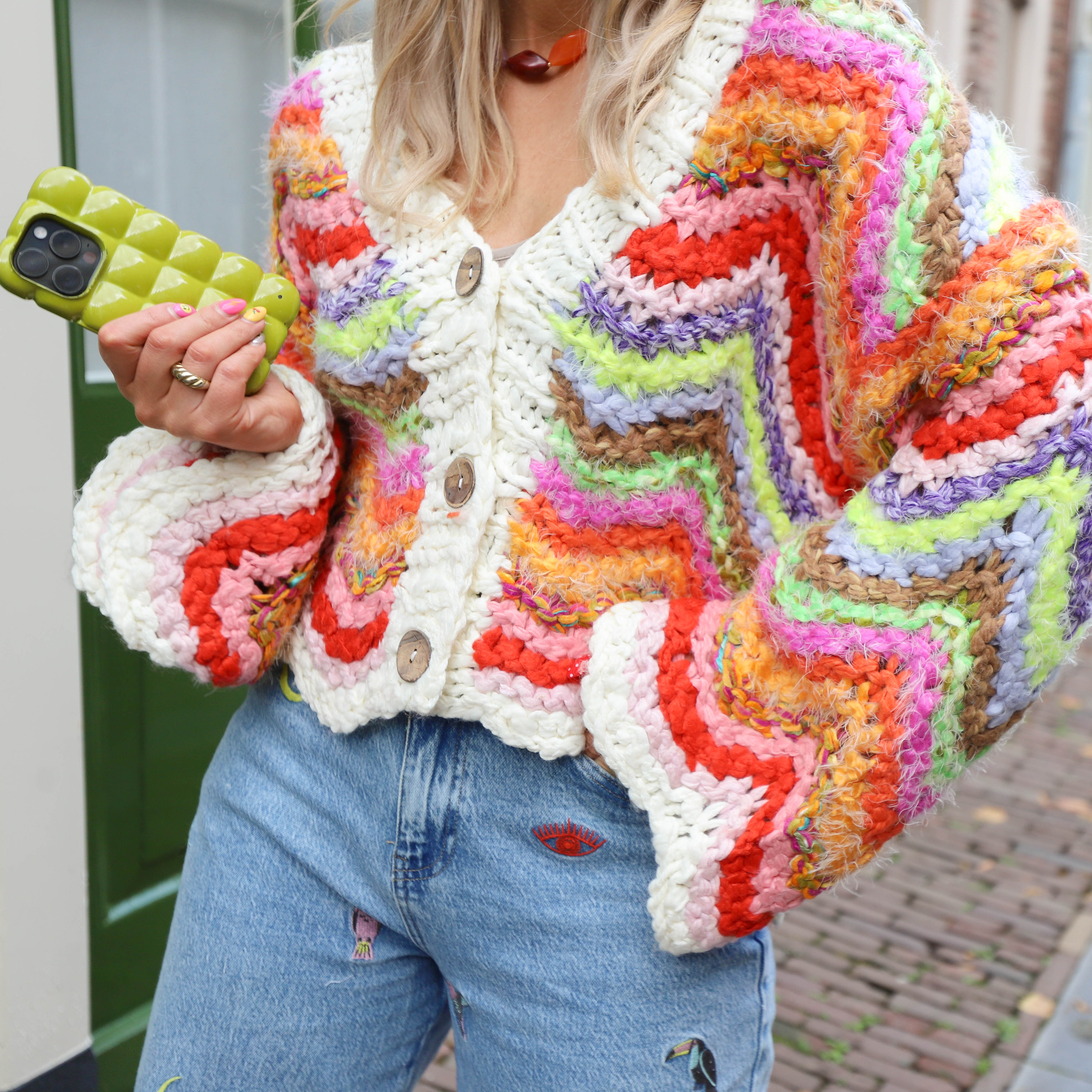 Voeg een artistiek tintje toe aan je outfit met onze handmade cardigan multi waves. Dit handgebreide vest heeft een uniek golfpatroon in diverse felle en vrolijke kleuren. De dikke, grof gebreide stof en de houten knoopjes geven het vest een authentieke, ambachtelijke uitstraling. Perfect om elke basic look direct te transformeren tot een kleurrijk geheel.