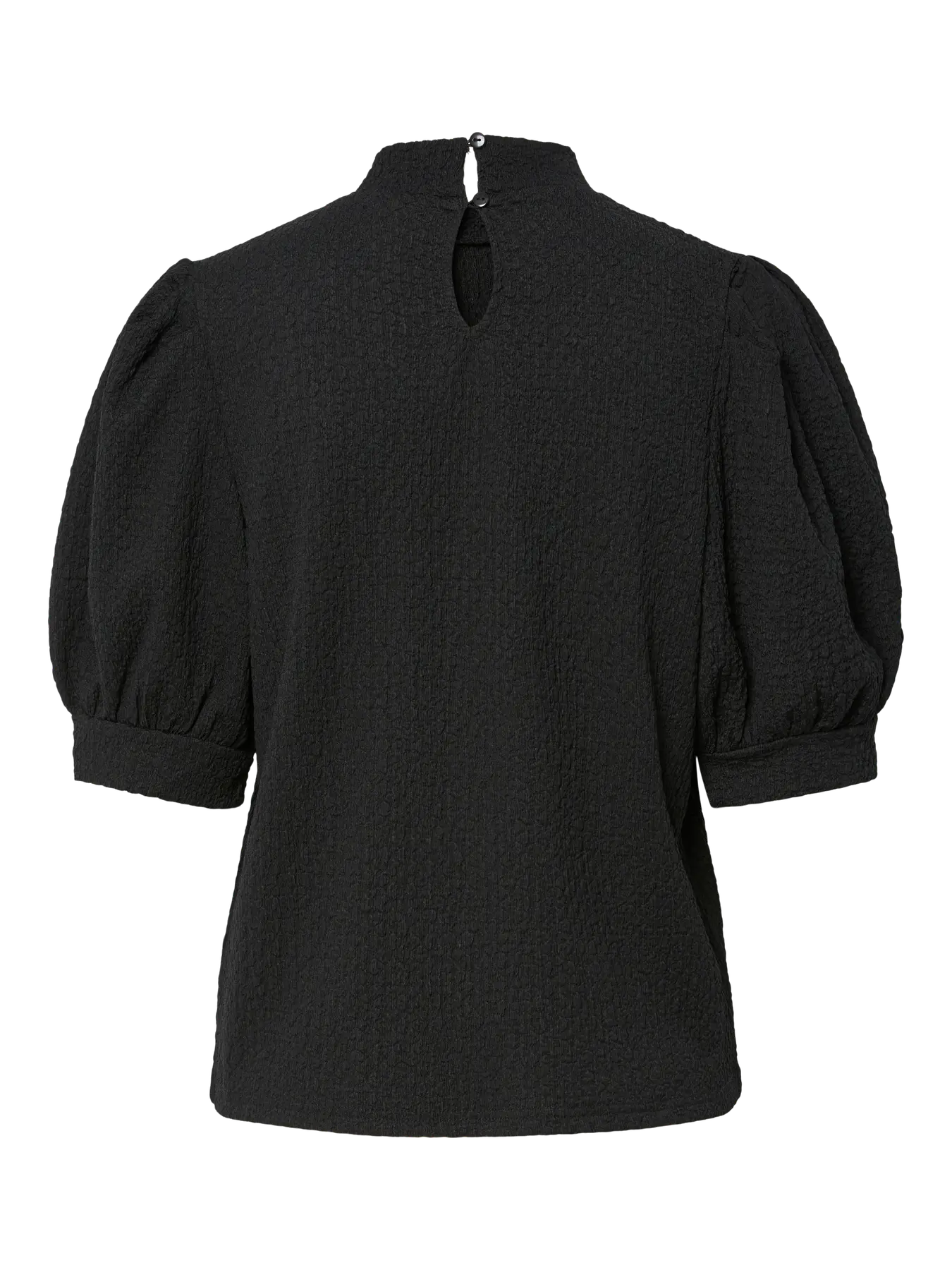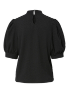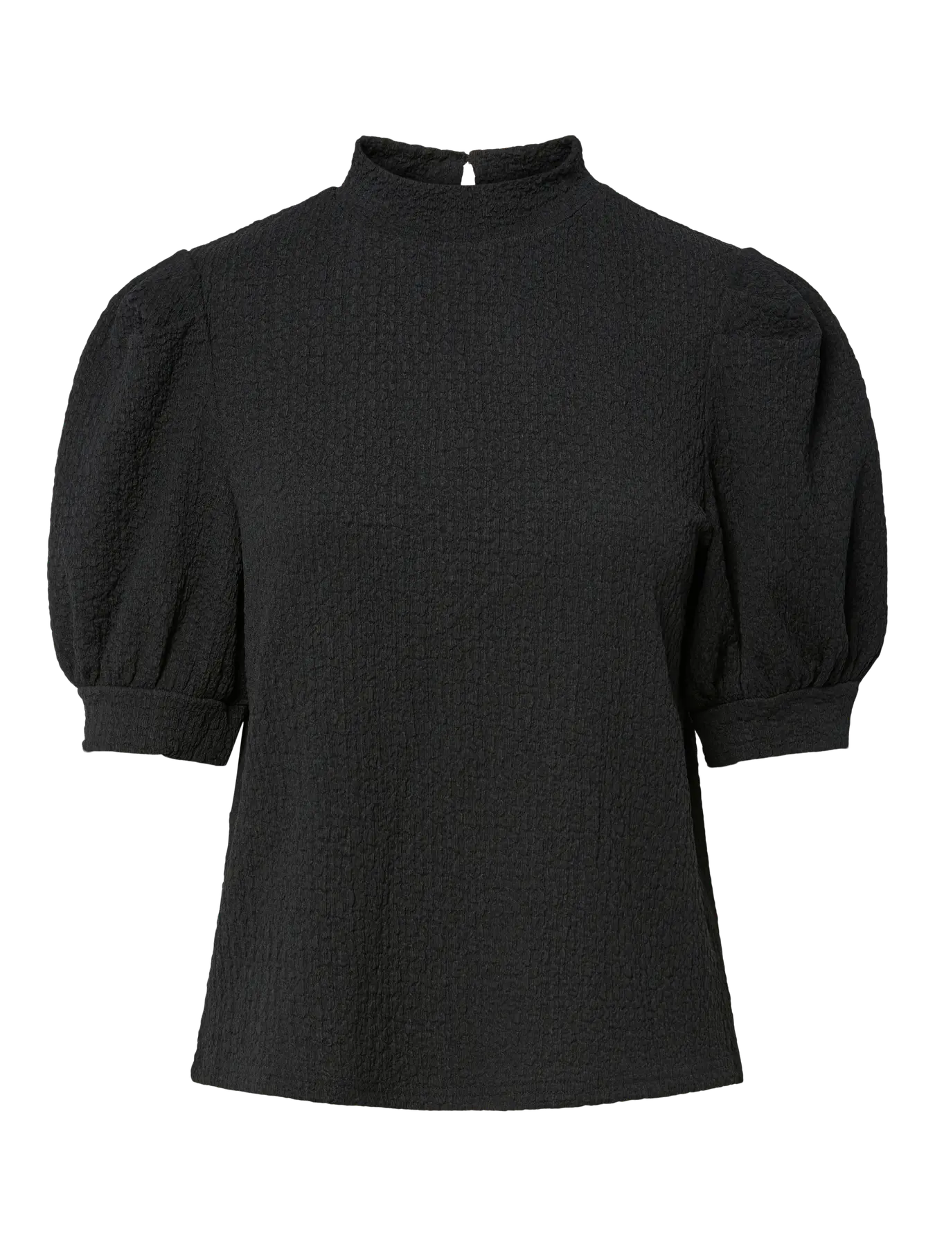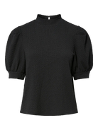 Een prachtige top in een klassieke zwarte kleur. De top heeft een opvallend gestructureerd ontwerp met een hoge hals en korte pofmouwen. Het aansluitende model en de rekbare stof zorgen voor een perfecte pasvorm.