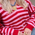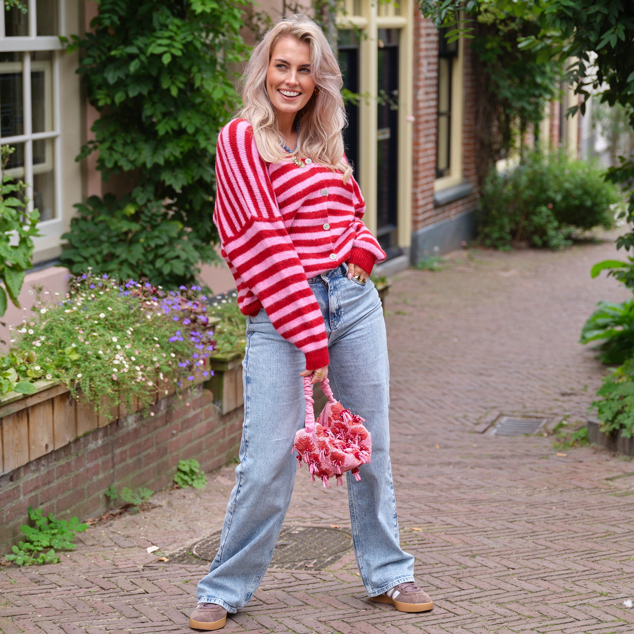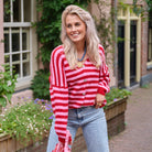 Het Joy streep vest is een vrolijke, oversized toevoeging die direct kleur geeft aan je outfit. Dit heerlijk zachte vest is gebreid in een opvallend roze met rood streepdessin en heeft een flatterende V-hals en een knoopsluiting. De wijde mouwen en de comfortabele pasvorm maken dit vest perfect om als een warm vest te dragen of gesloten als een trui. Combineer dit vest met een eenvoudige zwarte broek om de felle kleuren eruit te laten springen, of draag hem over een jurk voor een warme, speelse look.