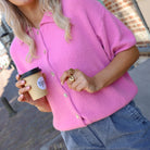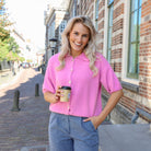 Dit zachte, roze vest is een comfortabele en elegante toevoeging aan je garderobe. Het vest heeft een klassieke kraag en sluit met subtiele, glimmende knoopjes. De zachte, harige textuur en de losse pasvorm maken dit vest ideaal om te dragen over een top of jurk, perfect voor een stijlvolle gelaagde look.