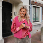 Deze zachte sweater met een opvallend gestreept patroon in verschillende roze tinten is een comfortabele en stijlvolle toevoeging aan je garderobe. De trui heeft een klassieke ronde hals en boorden aan de mouwen en onderkant. De ruime pasvorm en de langere lengte maken dit een perfecte trui voor een casual en relaxte look.