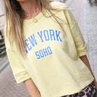 Haal de streetstyle vibe in huis met dit té gekke oversized T-shirt in een zonnige gele kleur! De opvallende 'NEW YORK SOHO' print in helderblauw geeft de top een sportieve en trendy uitstraling. Dankzij de ruime pasvorm, de verlaagde schoudernaden en de iets langere mouwen is dit shirt de perfecte mix tussen comfort en stijl. De zachte katoenmix zorgt ervoor dat hij de hele dag heerlijk zit.