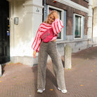 Deze korte, gebreide trui is een stijlvolle toevoeging aan je garderobe. De trui heeft brede strepen in lichtroze en felrood, wat zorgt voor een opvallende look. De boothals en de wijde mouwen met ribbels geven de trui een speels karakter. De cropped lengte maakt hem ideaal om te combineren met een high-waist broek of rok.