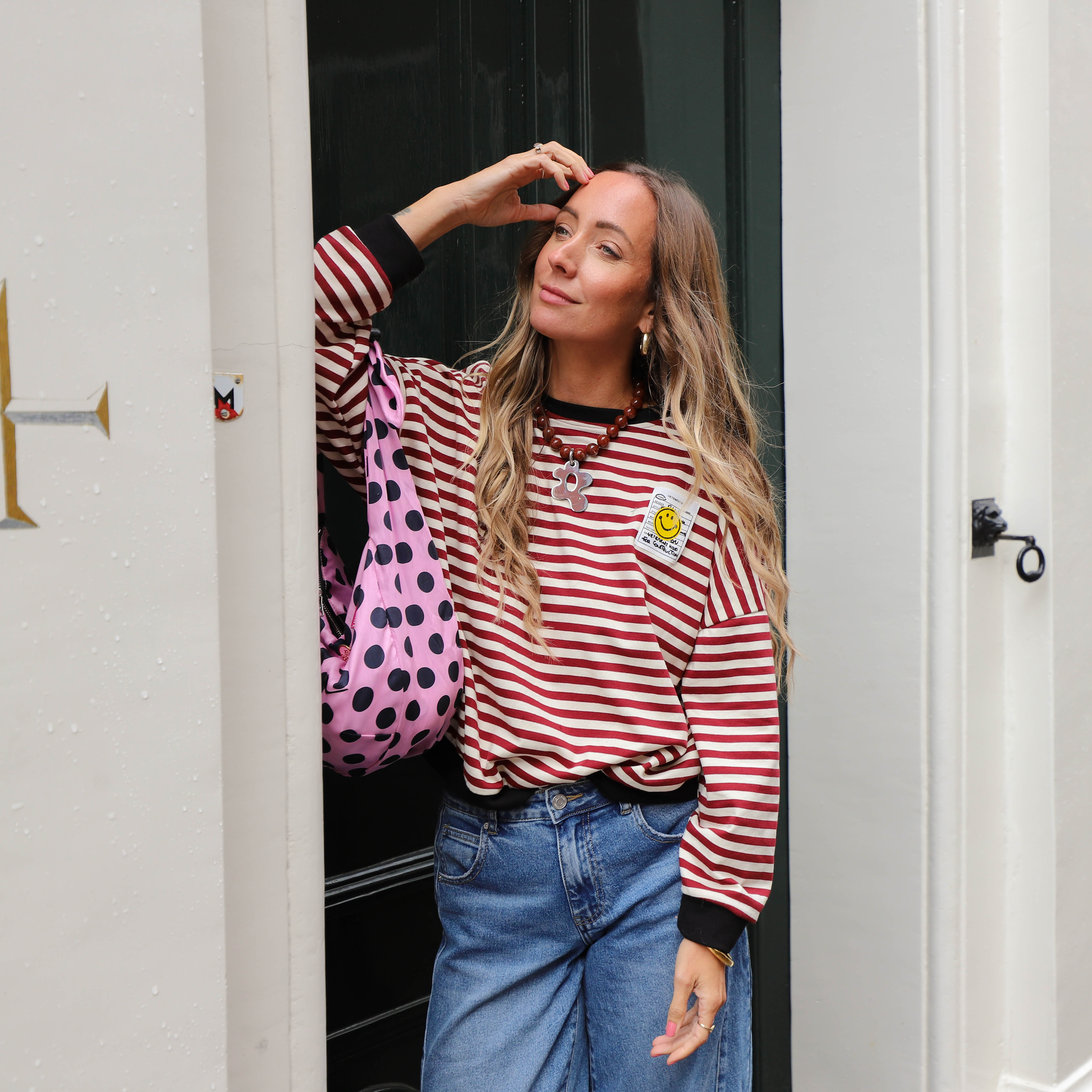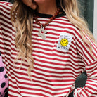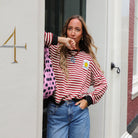 Geef je outfit een vrolijke en trendy twist met deze leuke sweater. De trui heeft een opvallend streepdessin in burgundy en wit en een ruime, comfortabele pasvorm. De sweater heeft een ronde hals met een ribgebreide boord en een patch van een smiley op de voorkant.