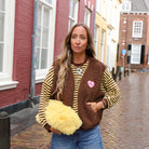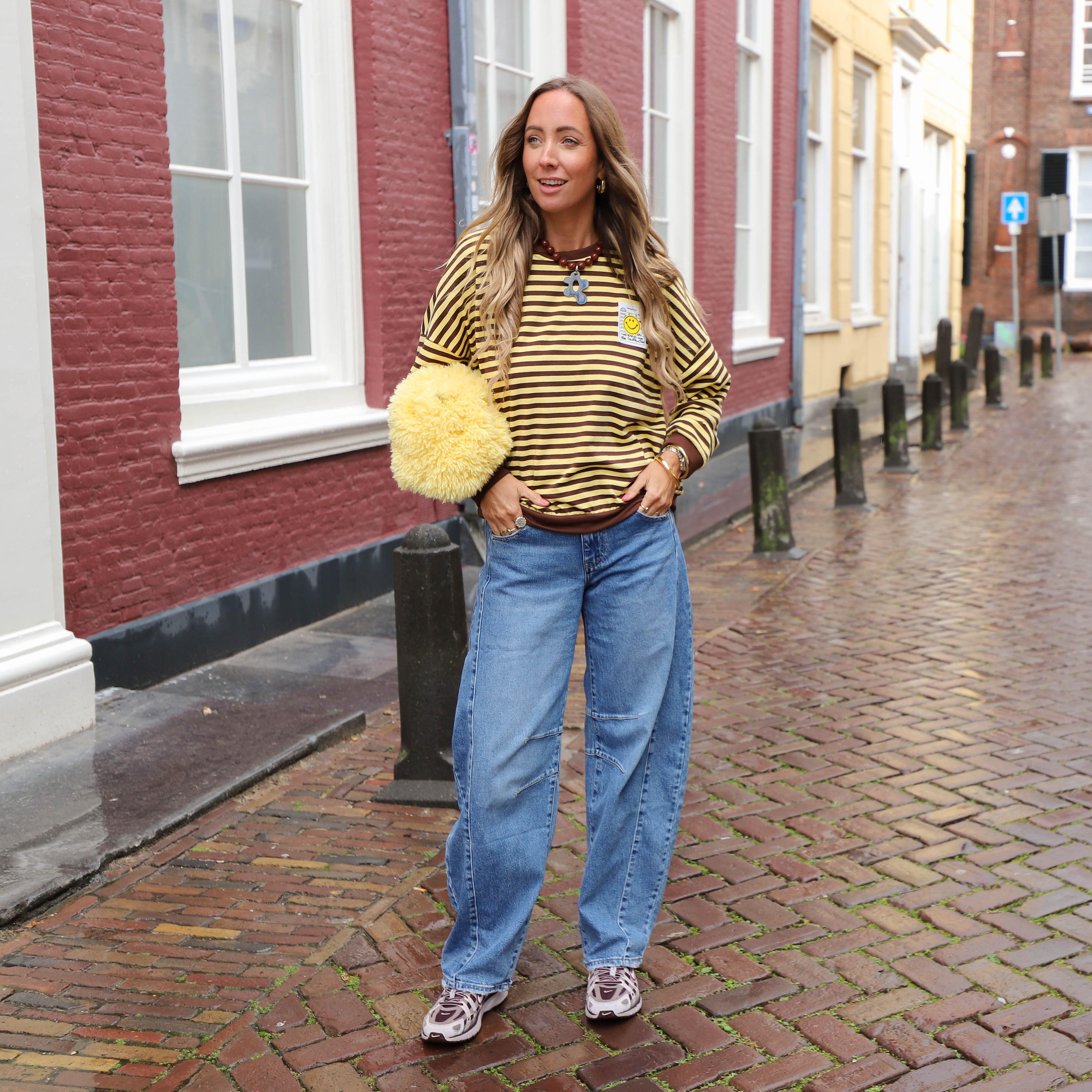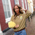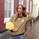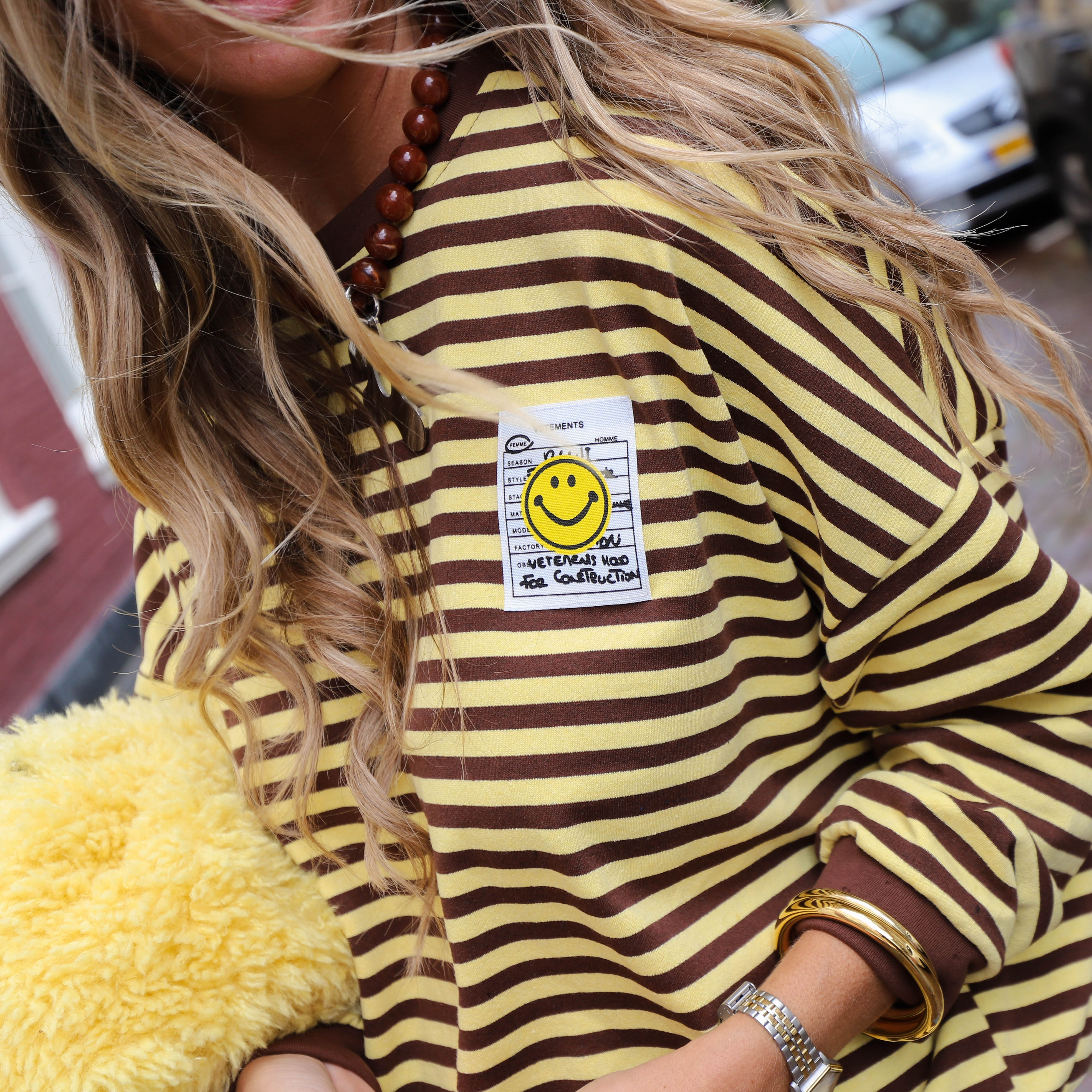 Geef je outfit een vrolijke en trendy twist met deze leuke sweater. De trui heeft een opvallend streepdessin in geel en bruin en een ruime, comfortabele pasvorm. De sweater heeft een ronde hals met een ribgebreide boord en een patch van een smiley op de voorkant.