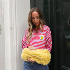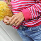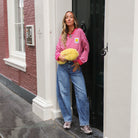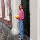 Geef je outfit een vrolijke en trendy twist met deze leuke sweater. De trui heeft een opvallend streepdessin in roze en paars en een ruime, comfortabele pasvorm. De sweater heeft een ronde hals met een ribgebreide boord en een patch van een smiley op de voorkant.