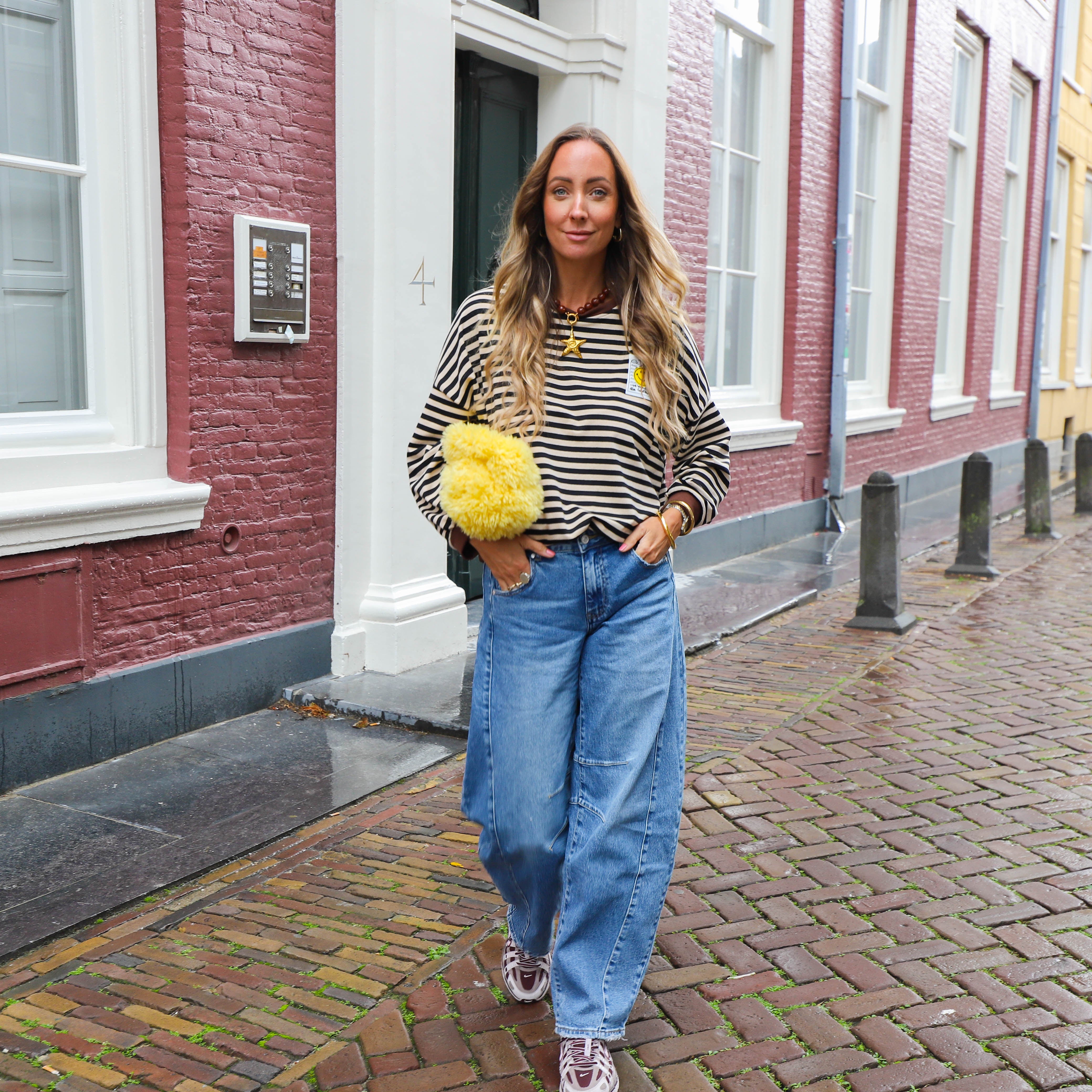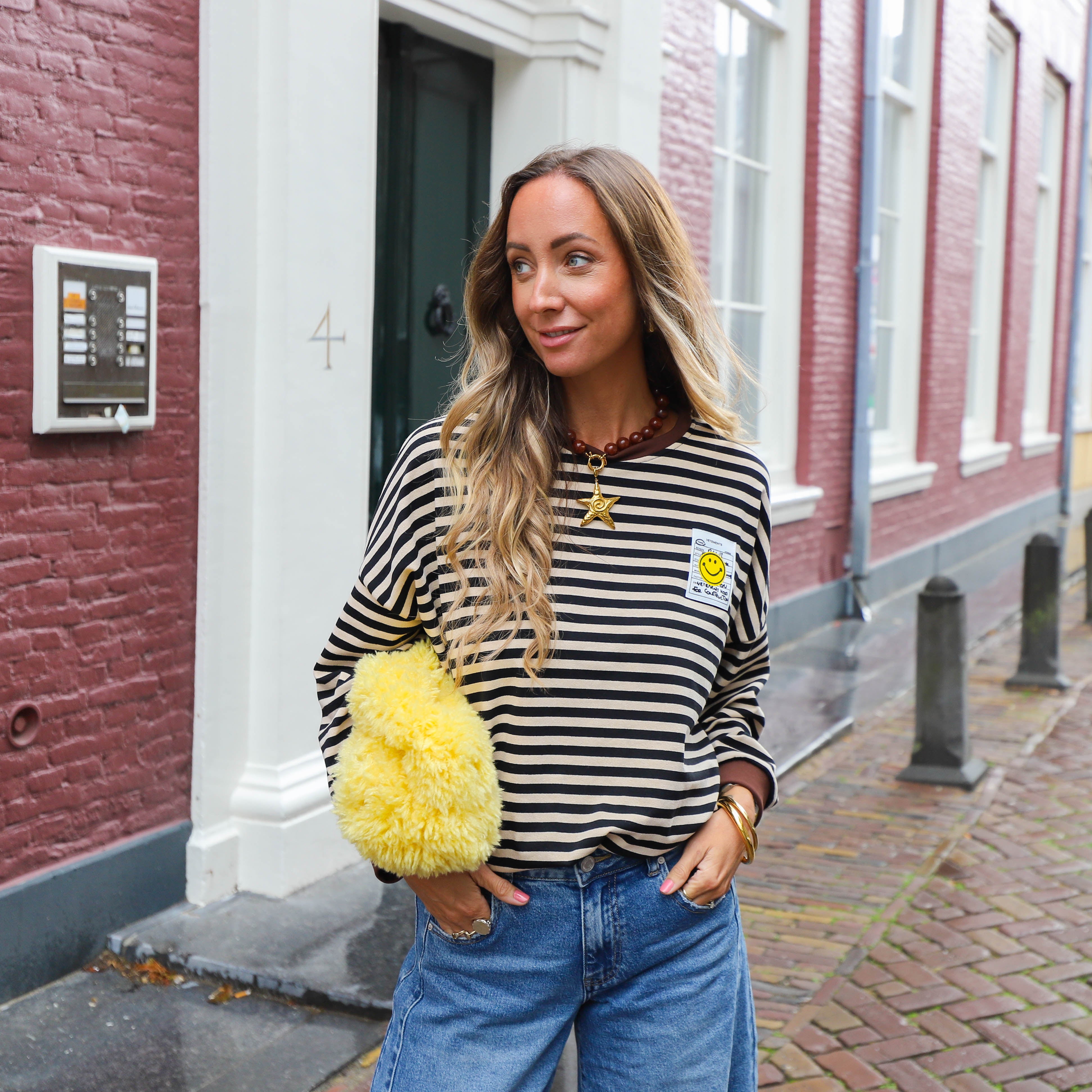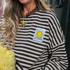 Geef je outfit een vrolijke en trendy twist met deze leuke sweater. De trui heeft een opvallend streepdessin in zwart en off-white en een ruime, comfortabele pasvorm. De sweater heeft een ronde hals met een ribgebreide boord en een patch van een smiley op de voorkant.