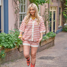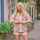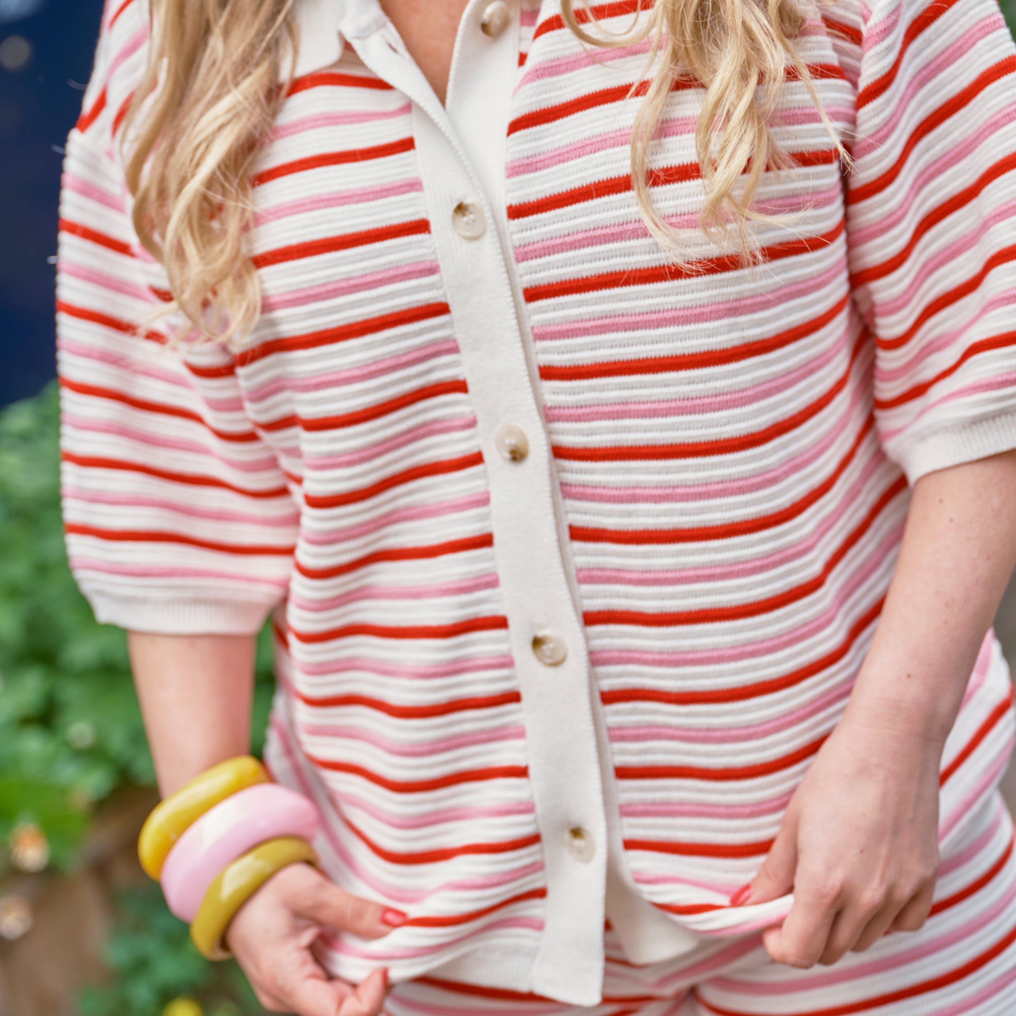 Deze charmante set is de perfecte aanvulling op je voorjaar- en zomergarderobe! De set straalt een klassieke, doch speelse vibe uit met zijn horizontaal gestreepte patroon in een frisse combinatie van roze, rood en een naturel (gebroken wit) tint. Het gebreide materiaal zorgt voor een comfortabele en luchtige pasvorm.