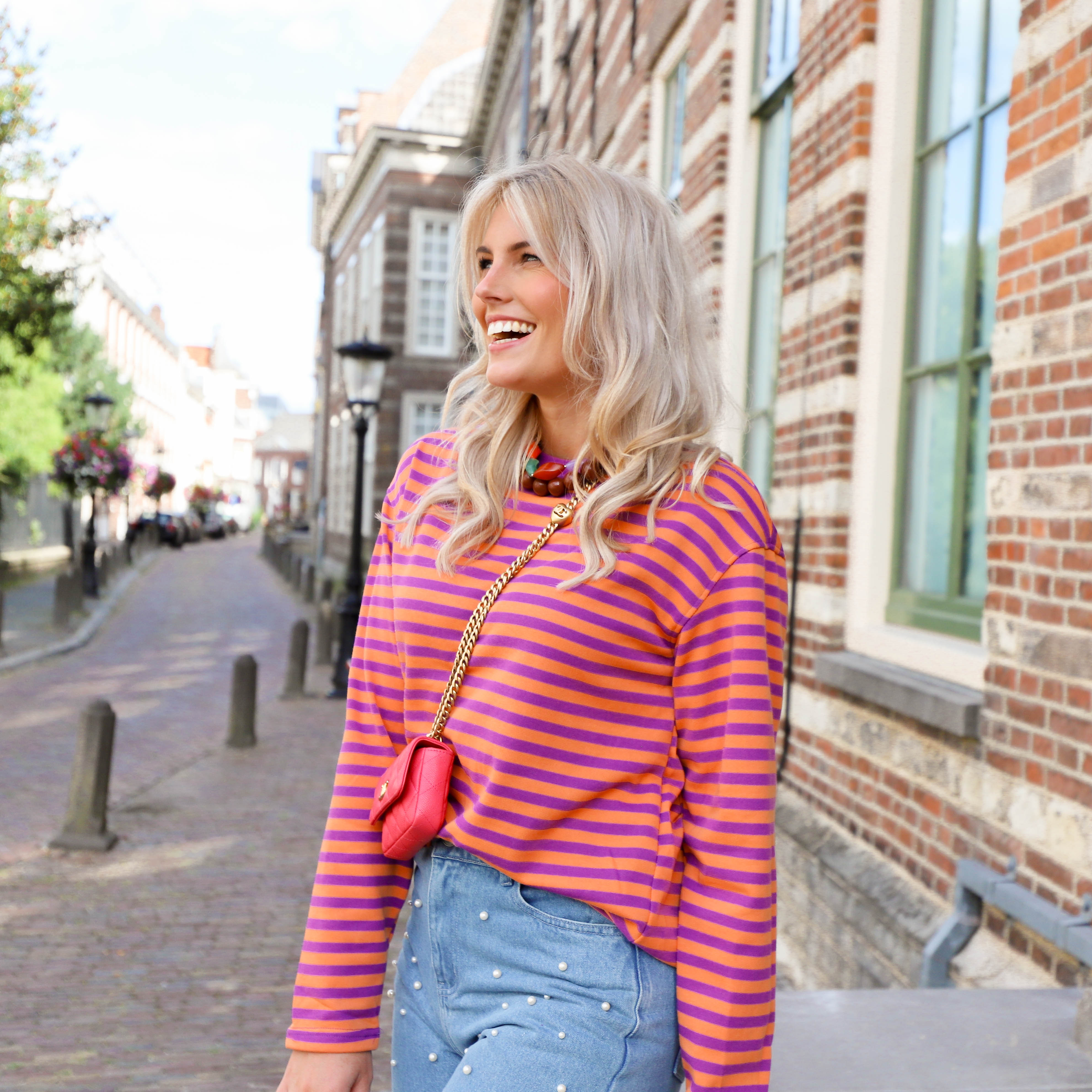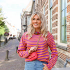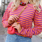 Deze leuke, oranje top met dunne paarse strepen is perfect voor het najaar! De strepen geven de top een speelse en trendy uitstraling. Perfect voor een casual dagje uit of een avondje op de bank. Combineer met een leuke jeans.