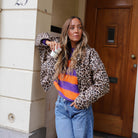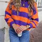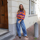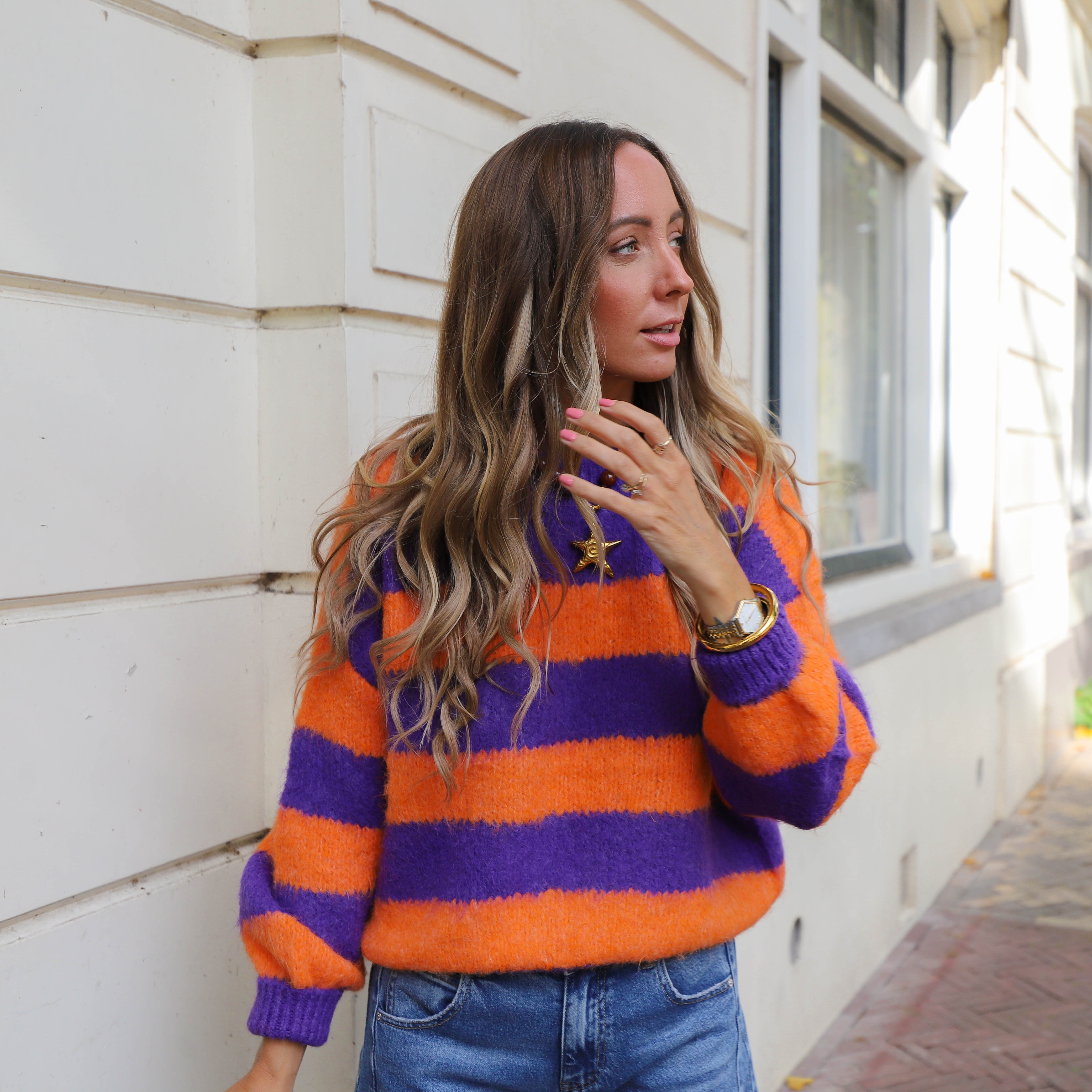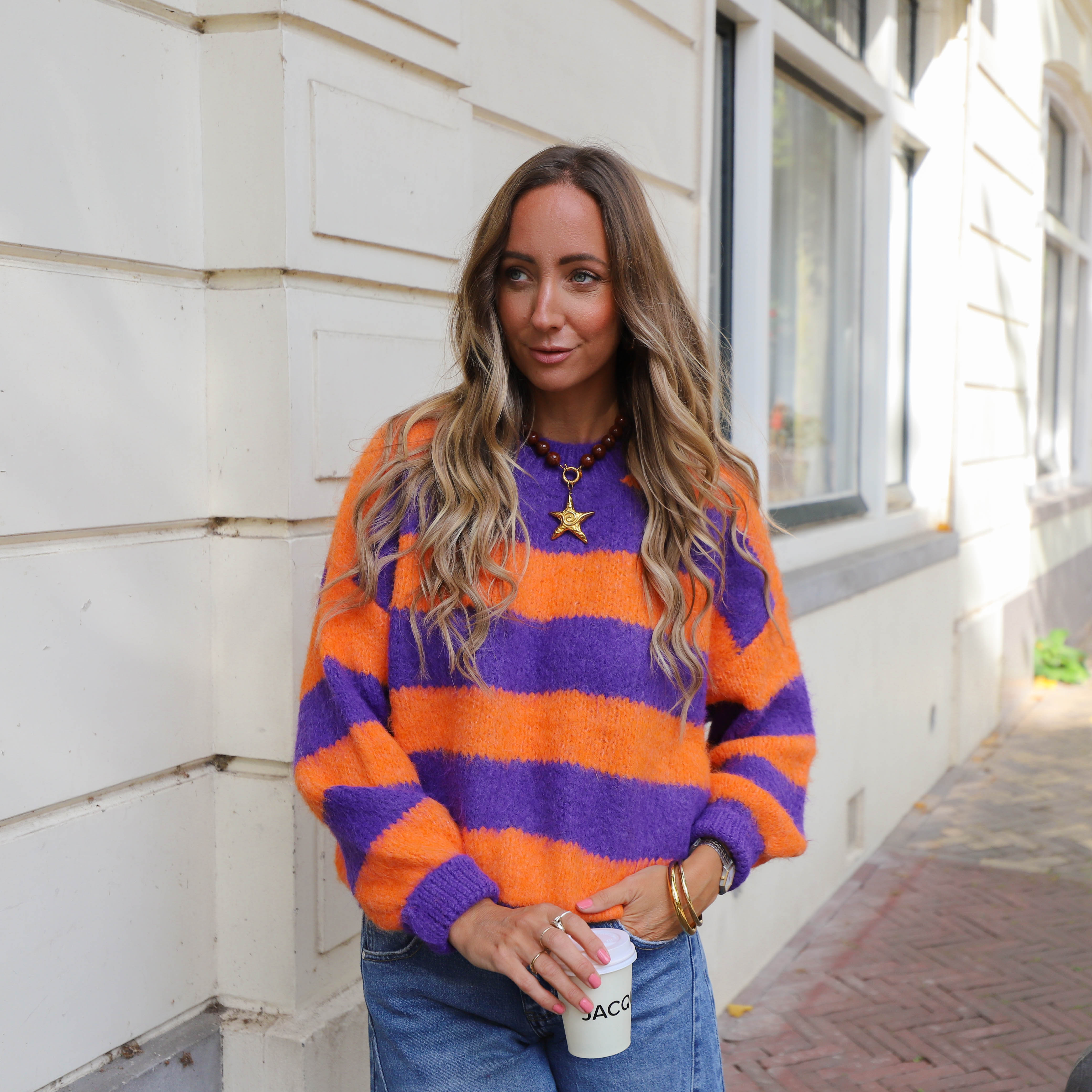 Geef je outfit een vrolijke en kleurrijke twist met deze fijne trui met strepen. Deze trui is gemaakt van een zachte en comfortabele mix en is perfect voor de koudere dagen. De trui heeft een ronde hals, lange mouwen en is voorzien van een opvallend streepdessin in paars en oranje.