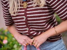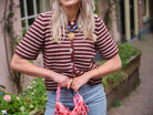 Dit Streep Vest is een charmante toevoeging aan je kledingcollectie. Het korte vest met korte mouwen is gebreid in een opvallende bordeauxrode kleur met contrasterende witte strepen. Het heeft een klassieke ronde halslijn en sluit met crèmekleurige knoopjes. Draag dit vest gesloten als een top met een high-waist jeans, of open over een basic T-shirt voor een speelse, gelaagde look. Dit vestje is ideaal om kleur en patroon toe te voegen aan je dagelijkse outfit!