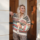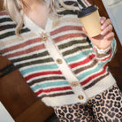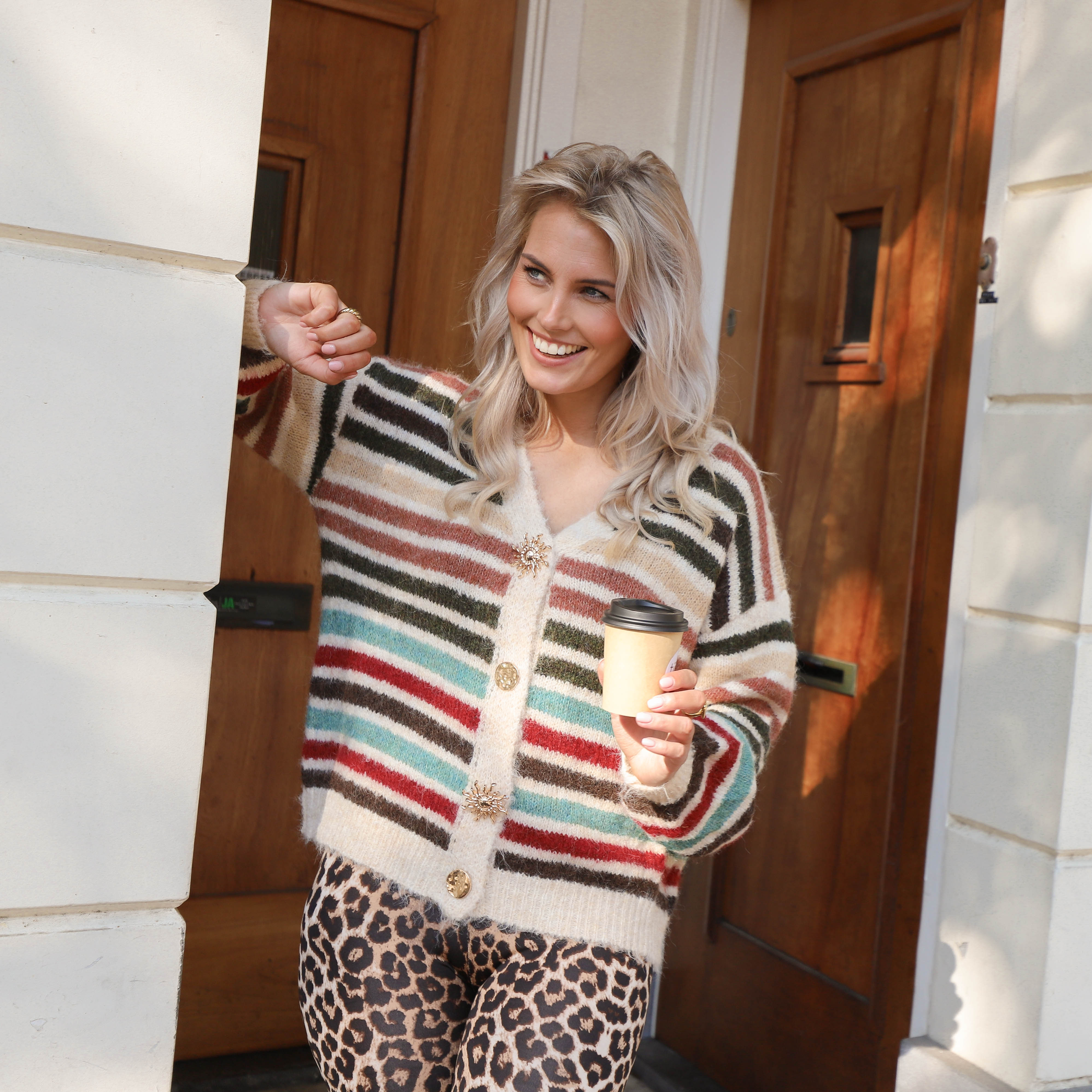 Dit kleurrijke vest in ecru heeft horizontale strepen in verschillende kleuren, zoals bruin, groen, rood en blauw. De zachte, harige textuur en de V-hals zorgen voor een comfortabele pasvorm. Het vest sluit met drie unieke, stervormige broches met glimmende details. Een stijlvolle en warme toevoeging aan je kledingkast, perfect voor een casual én trendy look.
