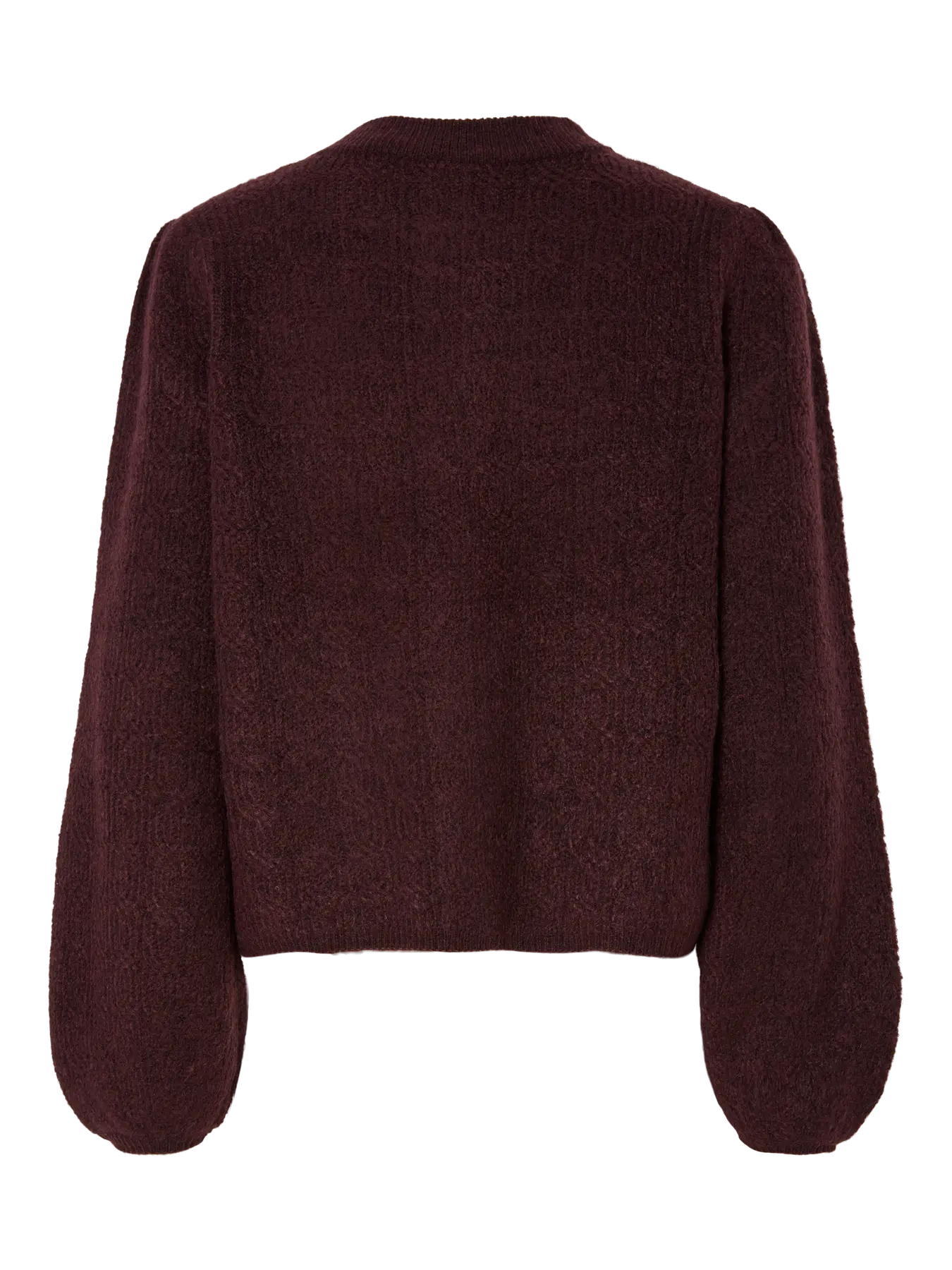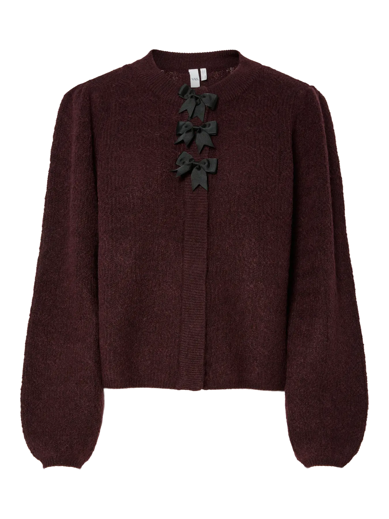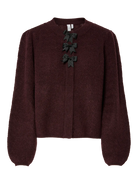 De YAS Bonsa Knit Cardigan is een must-have voor je garderobe, gemaakt van een zachte en warme mix met gerecycled polyester en wol. Dit cropped vest in een diepe, elegante port royale zwarte kleur heeft een normale pasvorm en is voorzien van opvallende strikjes op de voorkant.