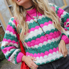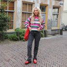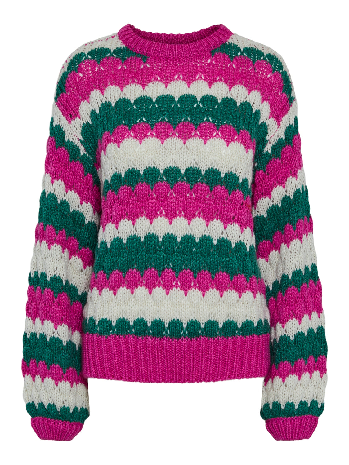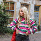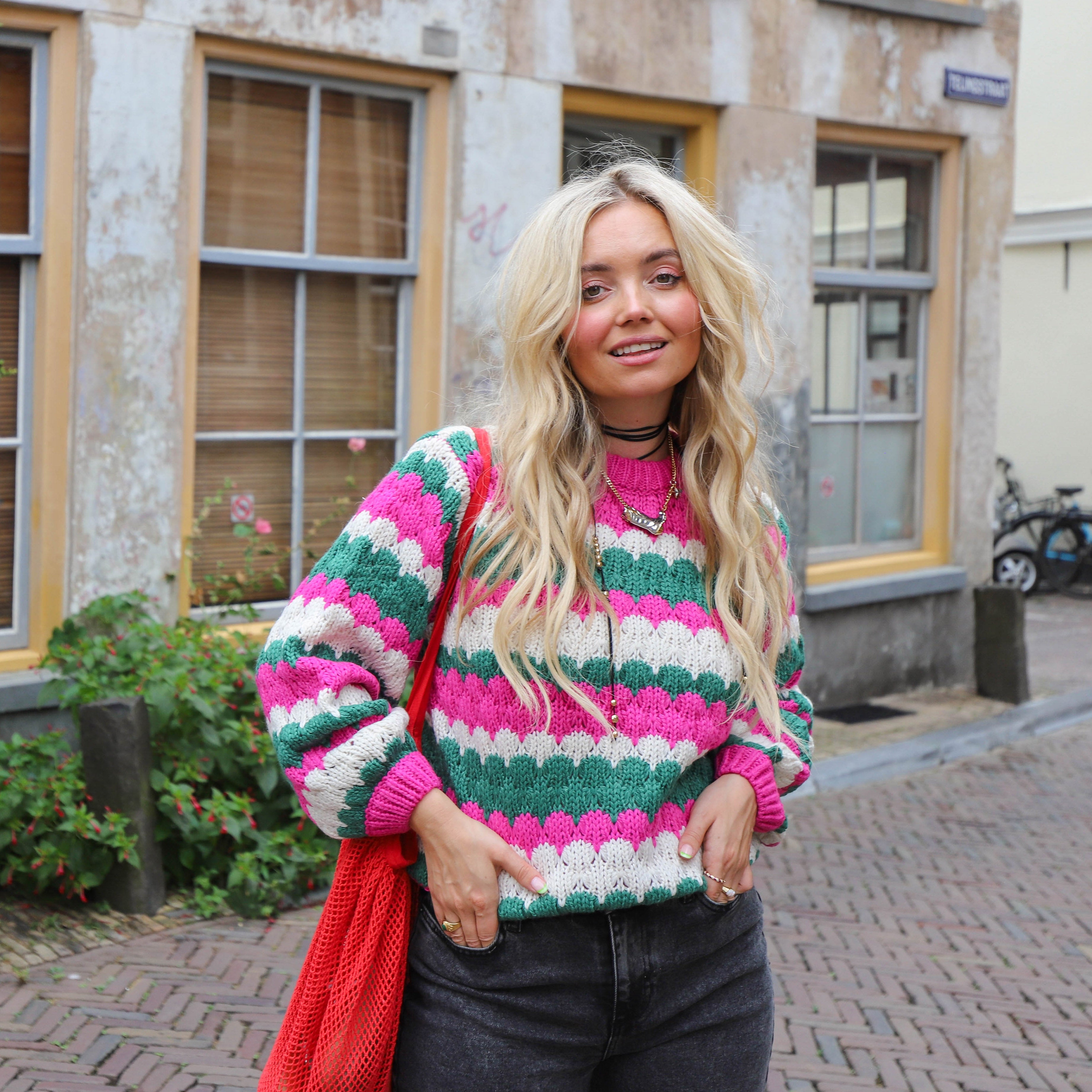 Gave trui van YAS met strepen in het roze, groen en off white. De trui heeft een gebubbeld motiefje en is leuk in combinatie met een grijze spijkerbroek.