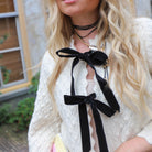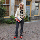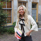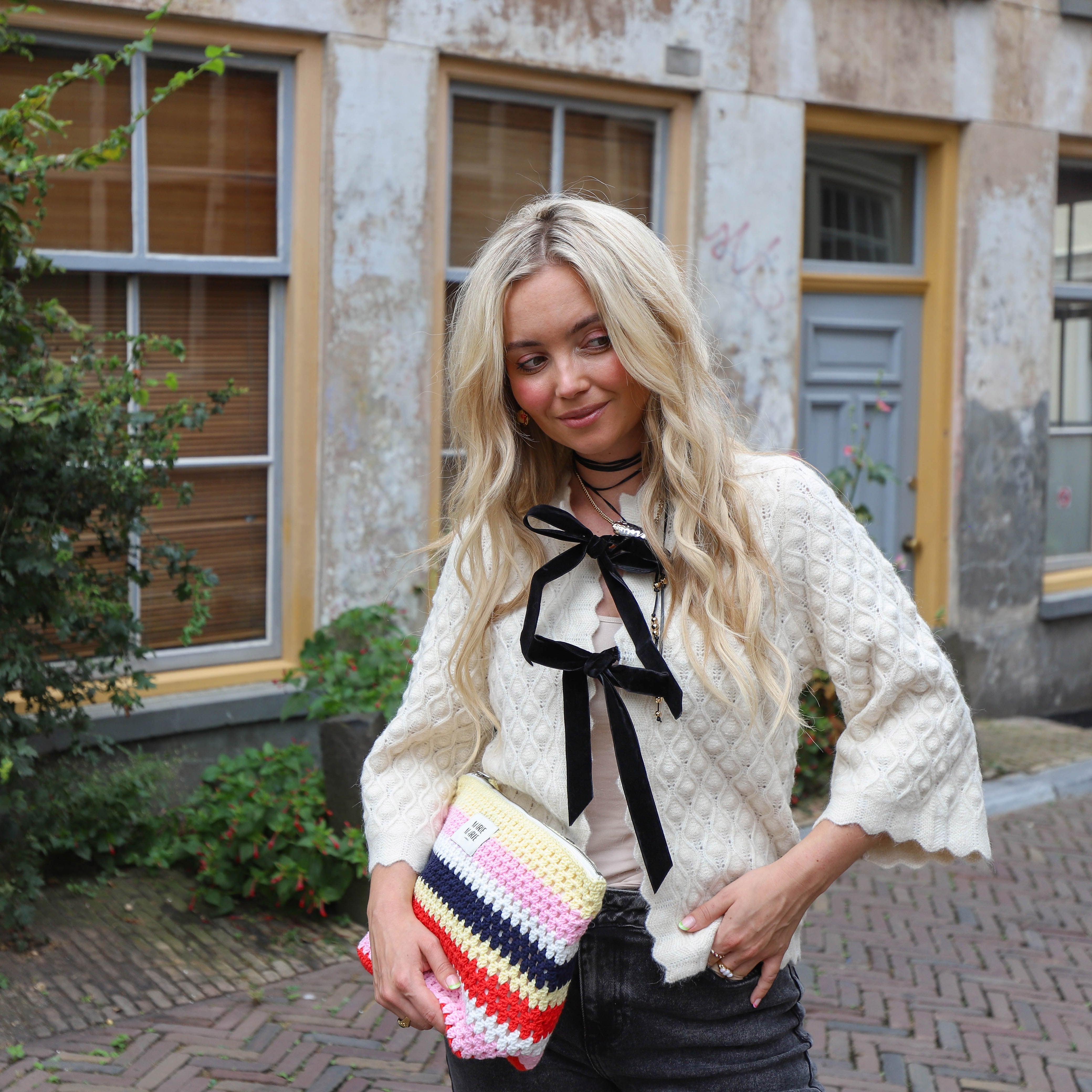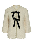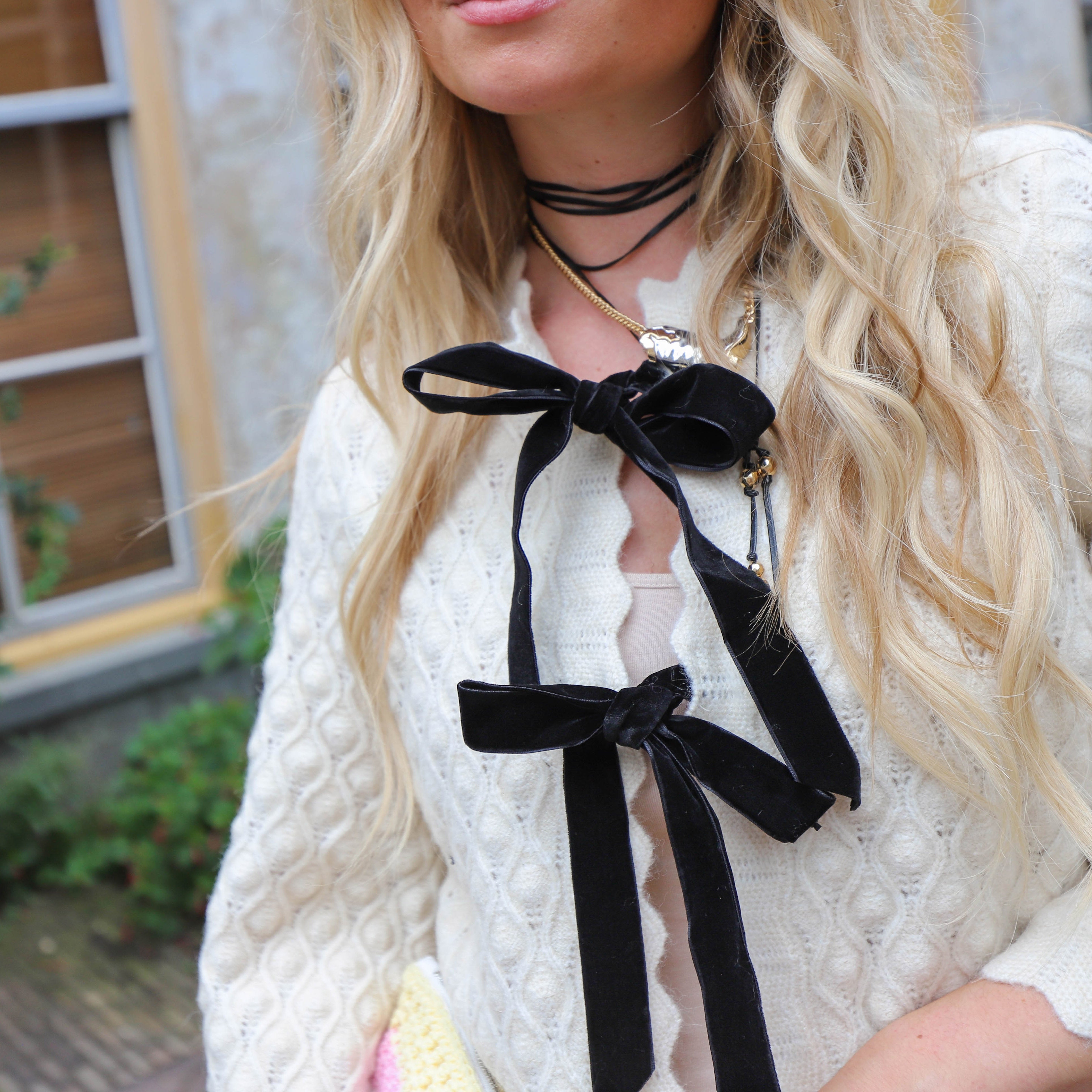 Mooi vestje van YAS in een lichte kleur met een paar zwarte strikken aan de voorkant. Het truitje heeft een bijzonder motiefje.