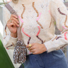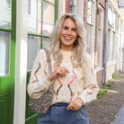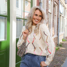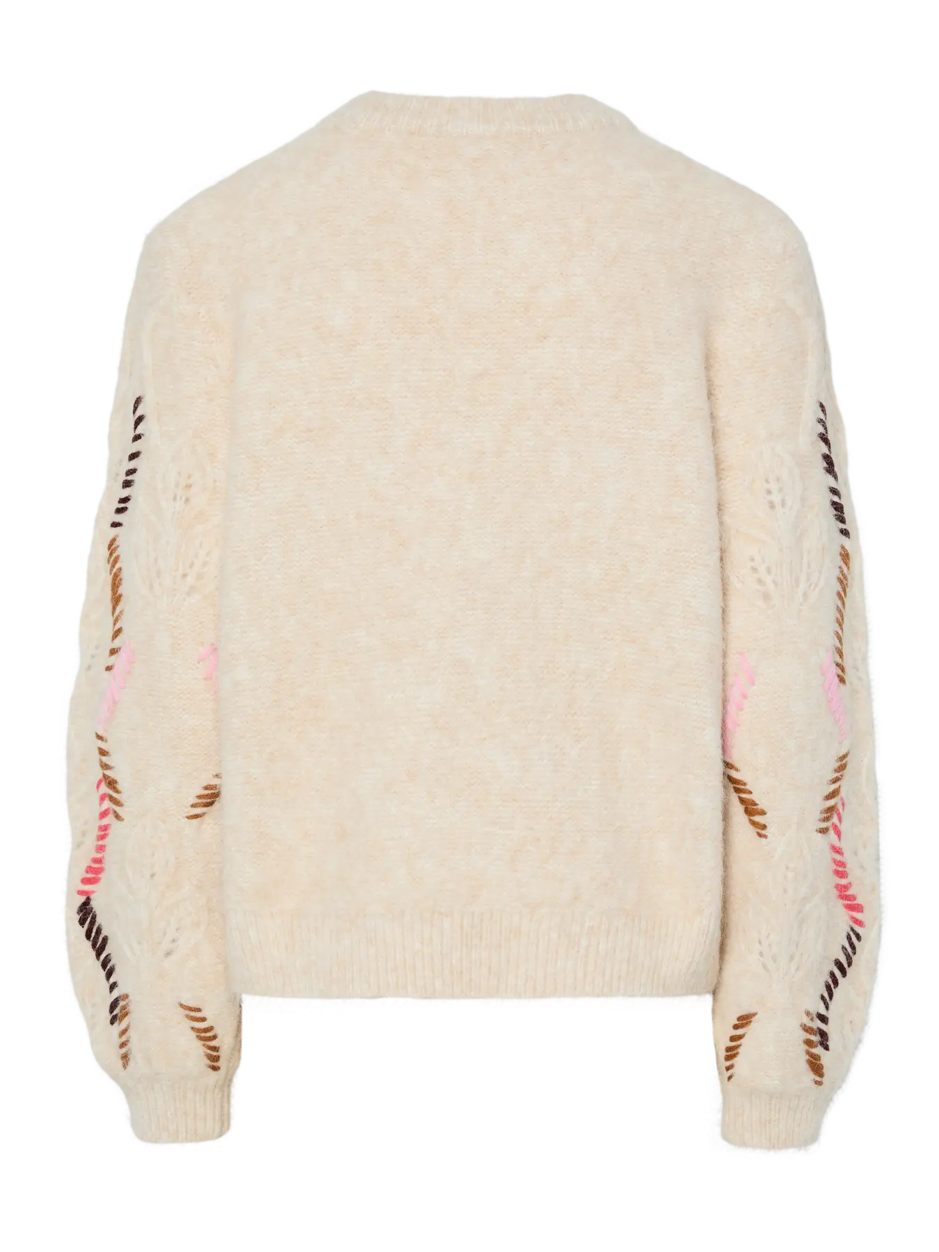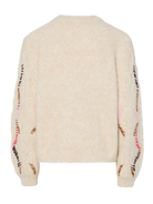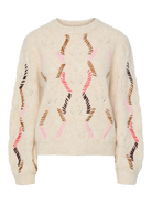 Deze gebreide pullover in een zachte, beige kleur is een unieke toevoeging aan je kledingkast. De trui heeft een prachtig ajourpatroon met bladvormige details en is verfraaid met speelse, gekleurde borduursels in bruin, roze en oranje. De ronde hals, de zachte stof en de elastische boorden zorgen voor een comfortabele pasvorm.