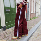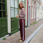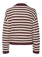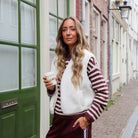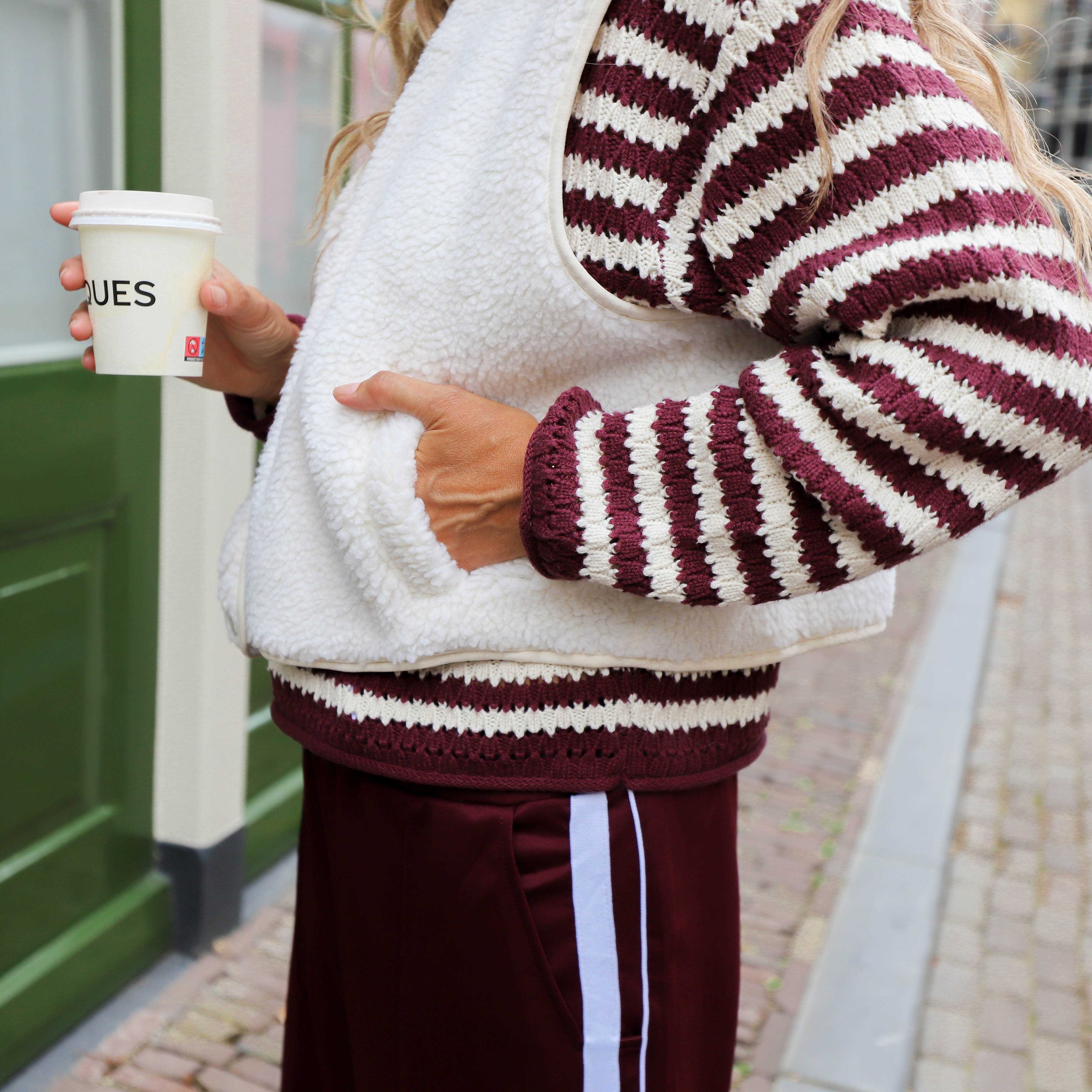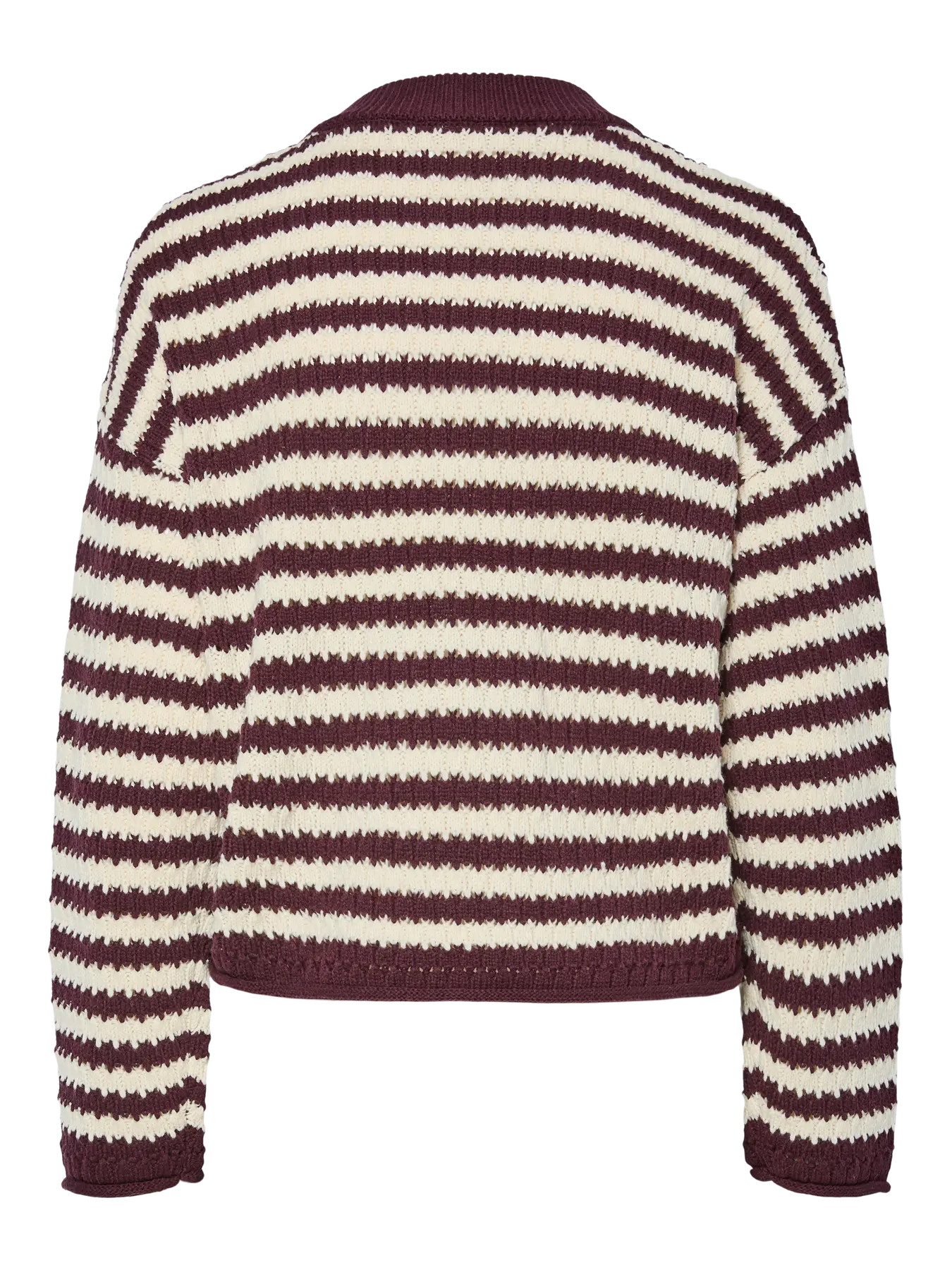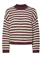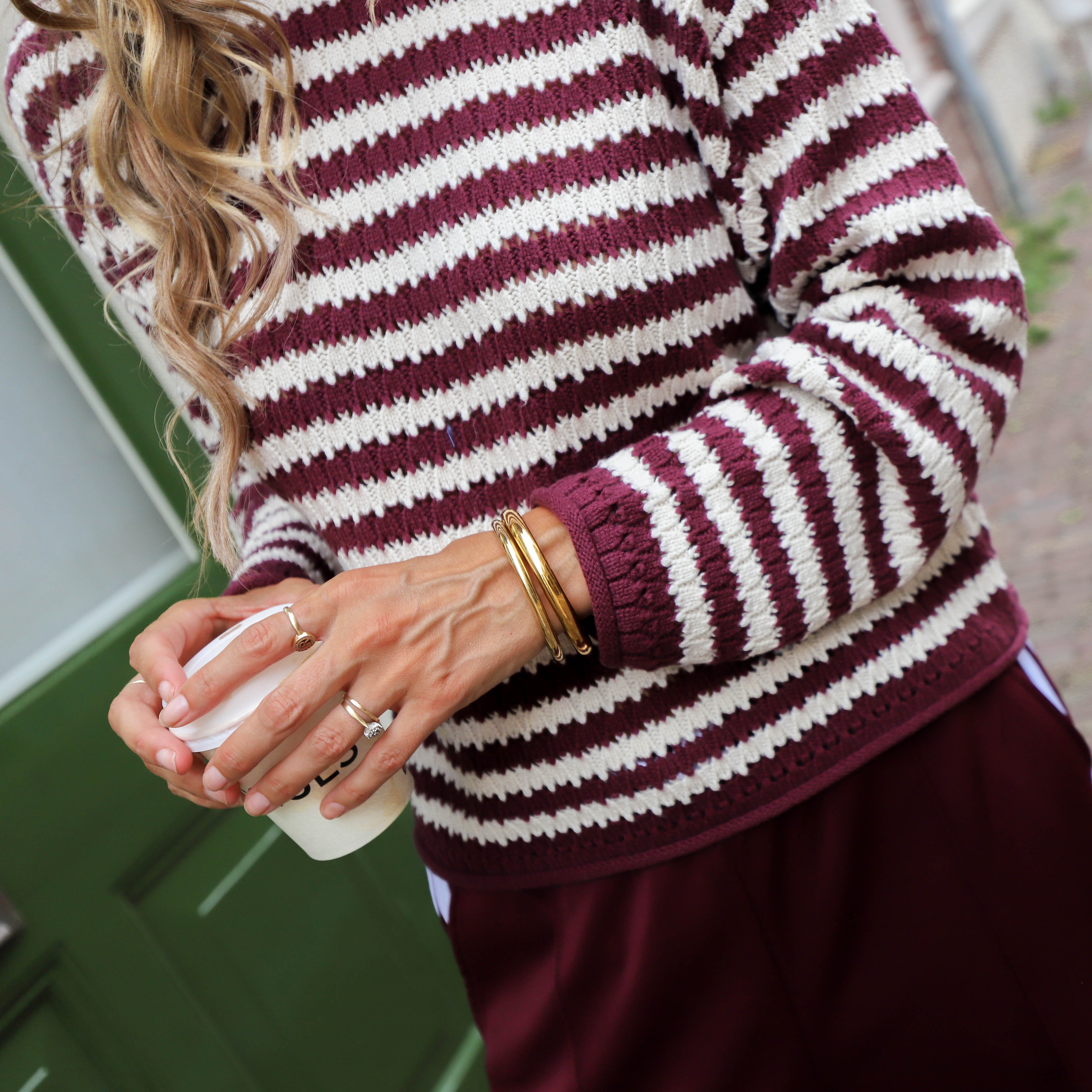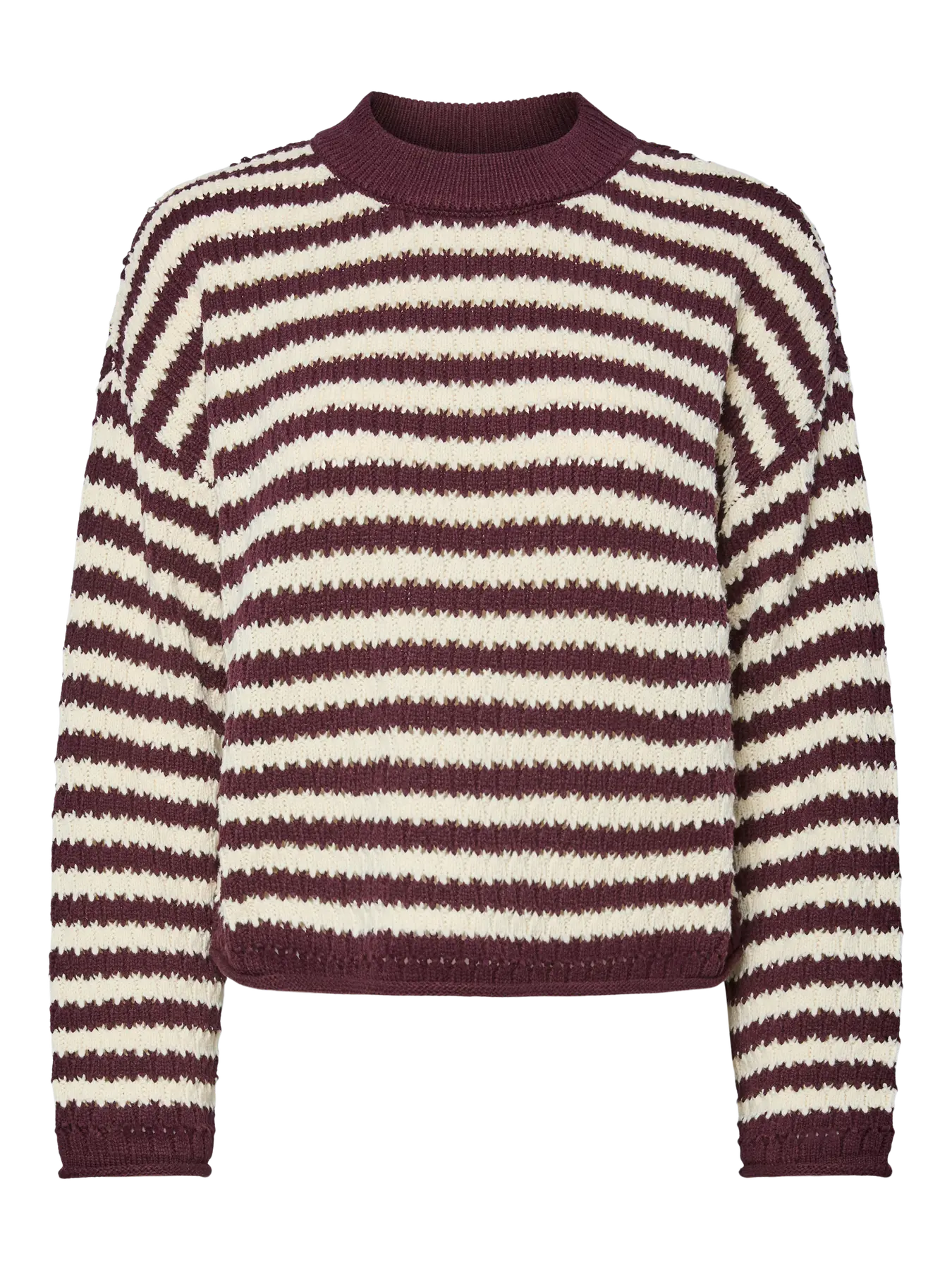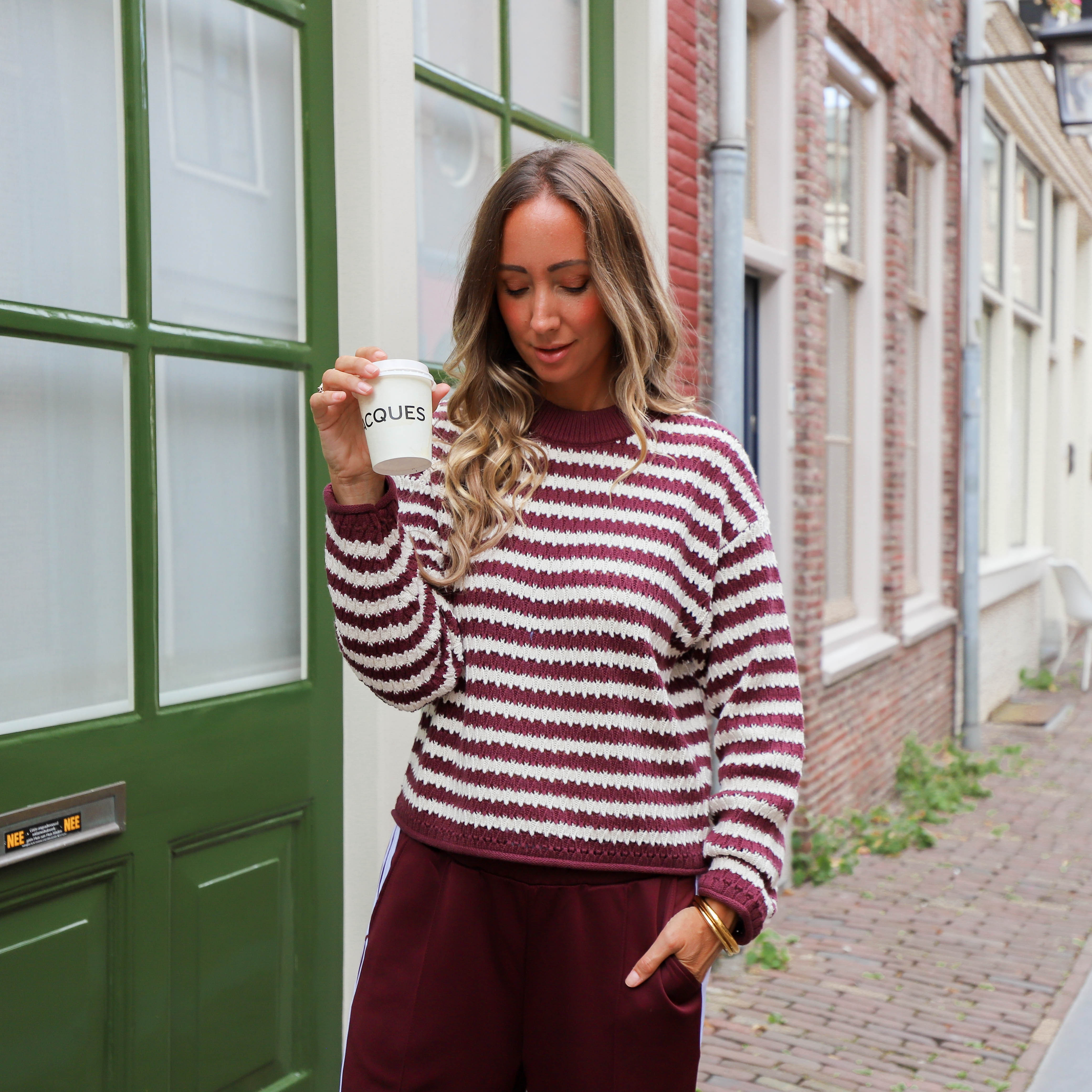 Deze gebreide trui heeft een tijdloos streepdessin in de kleuren burgundy en wit, wat zorgt voor een elegante en toch speelse uitstraling. De zachte en comfortabele stof, gecombineerd met de subtiele ribgebreide boorden aan de hals, mouwen en onderkant, maakt dit een perfect item voor elke dag.