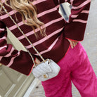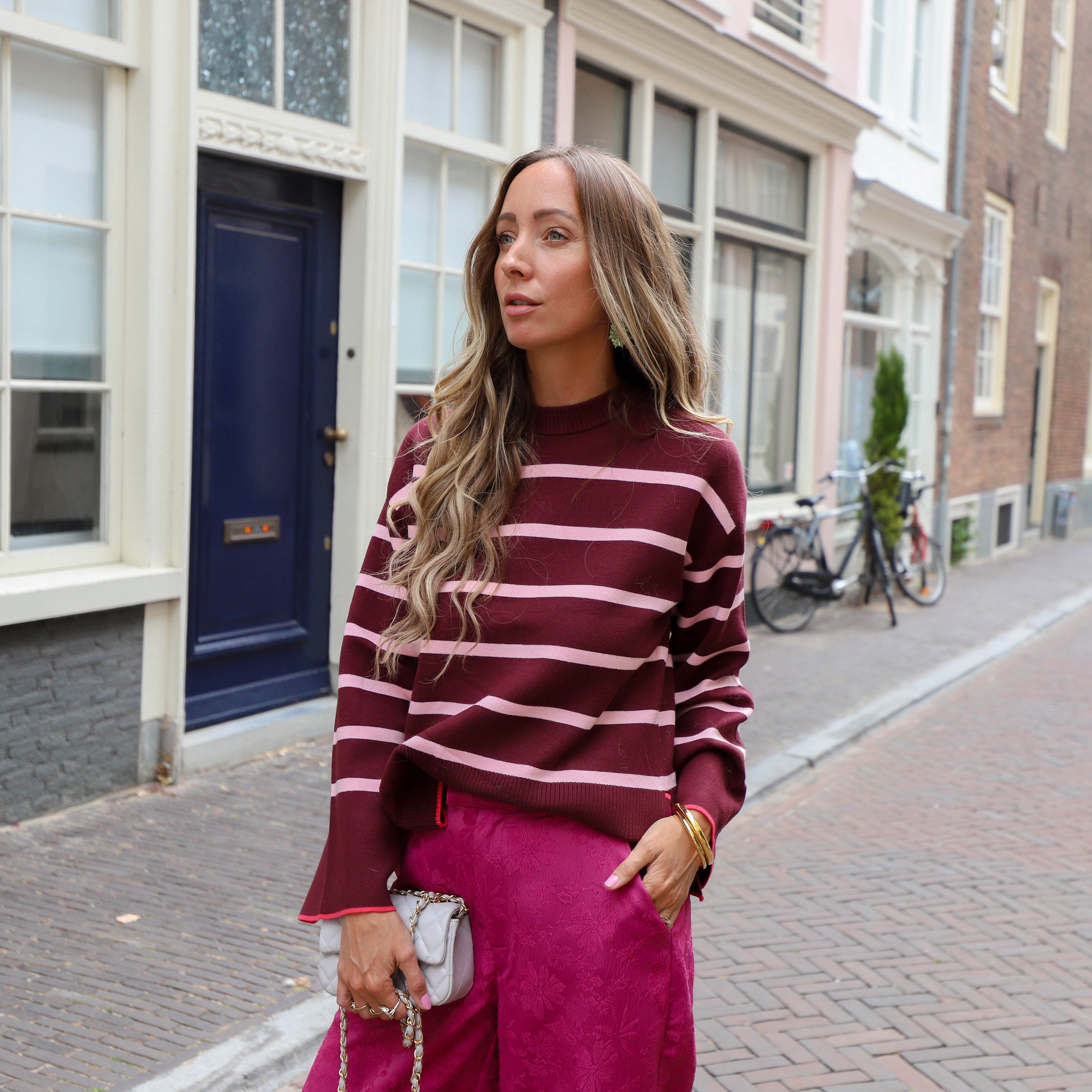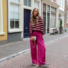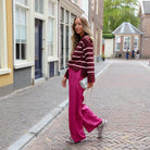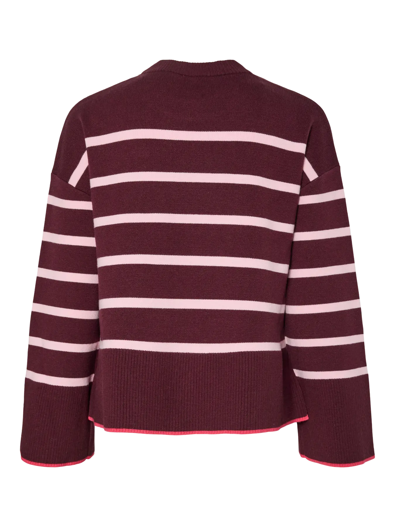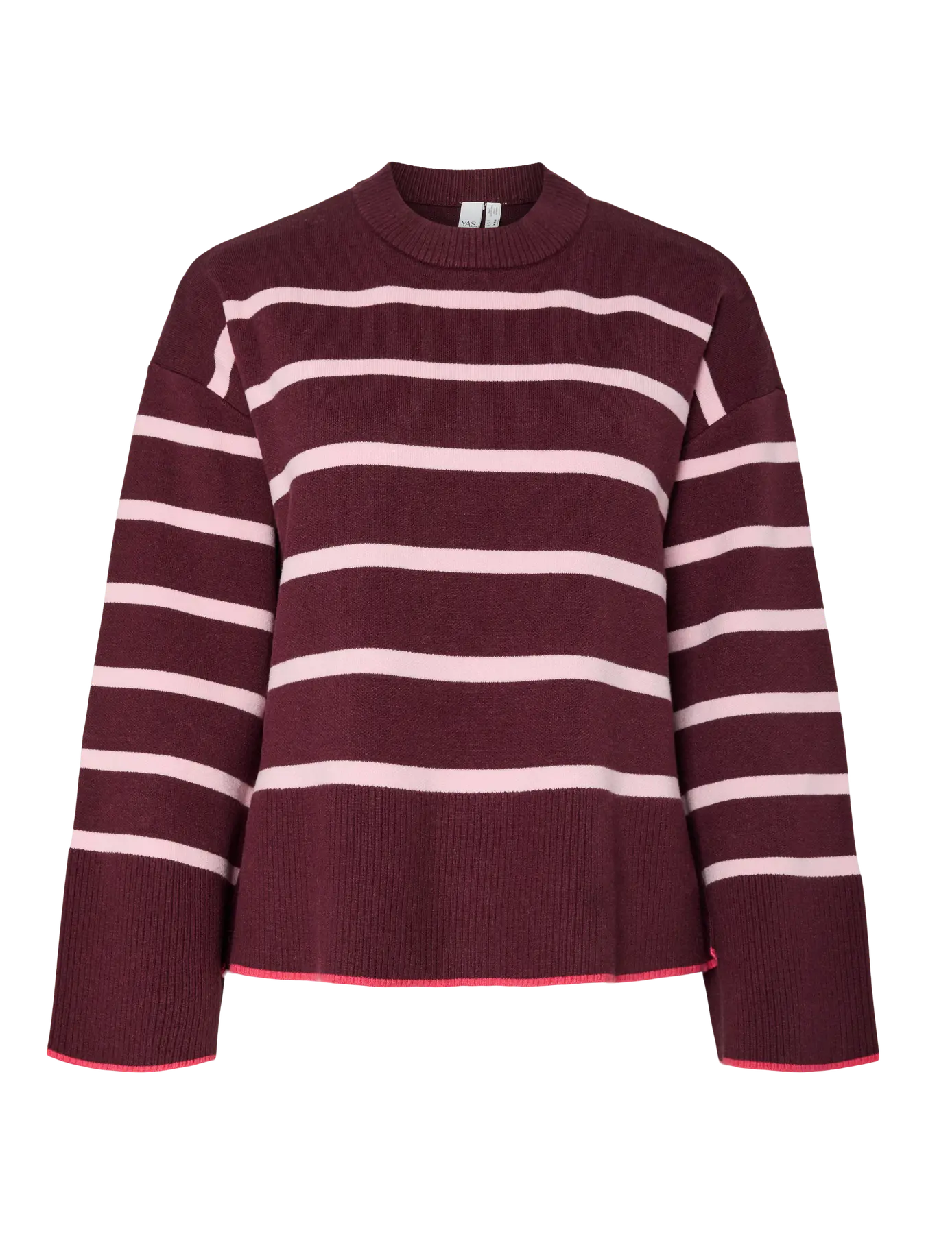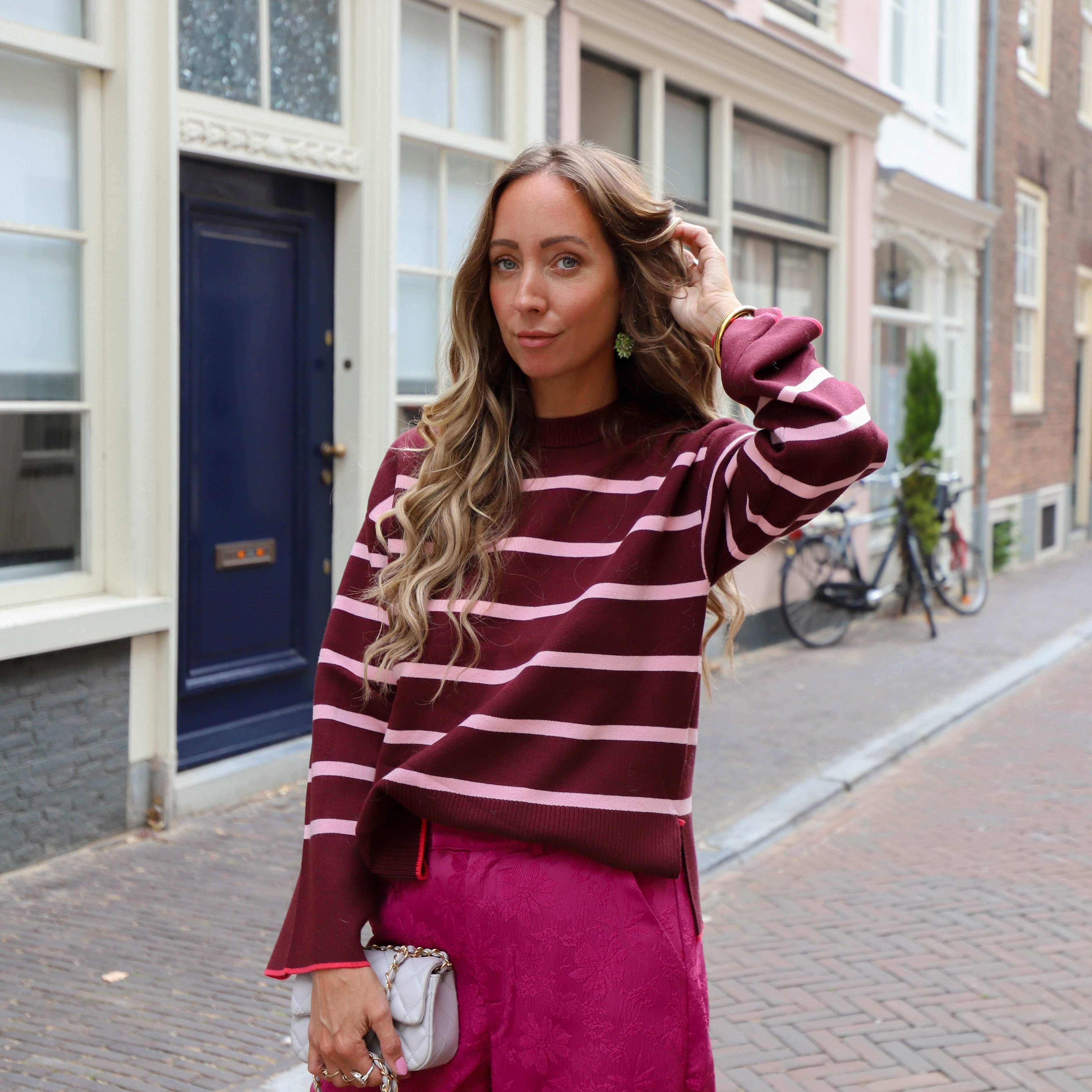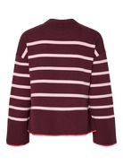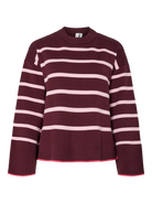 De Selma Knit Pullover is een comfortabele en veelzijdige trui met een speels gestreept patroon in bordeauxrood en roze. De sweater heeft een rechte, oversized pasvorm en een ronde hals. De lange mouwen en zachte stof geven het item een casual uitstraling, terwijl de golvende strepen zorgen voor een speelse en eigentijdse look. De onderkant van de sweater heeft een subtiele, roze afwerking.