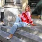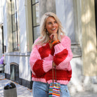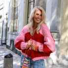 Geef je outfit een vrolijke, kleurrijke twist met ons 'zoe streep vest roze rood'. Dit handgemaakte vest is grof gebreid in een opvallend stree p patroon in roze en rood. De wijde pasvorm en de verlaagde schoudernaden zorgen voor een nonchalante, comfortabele uitstraling.