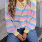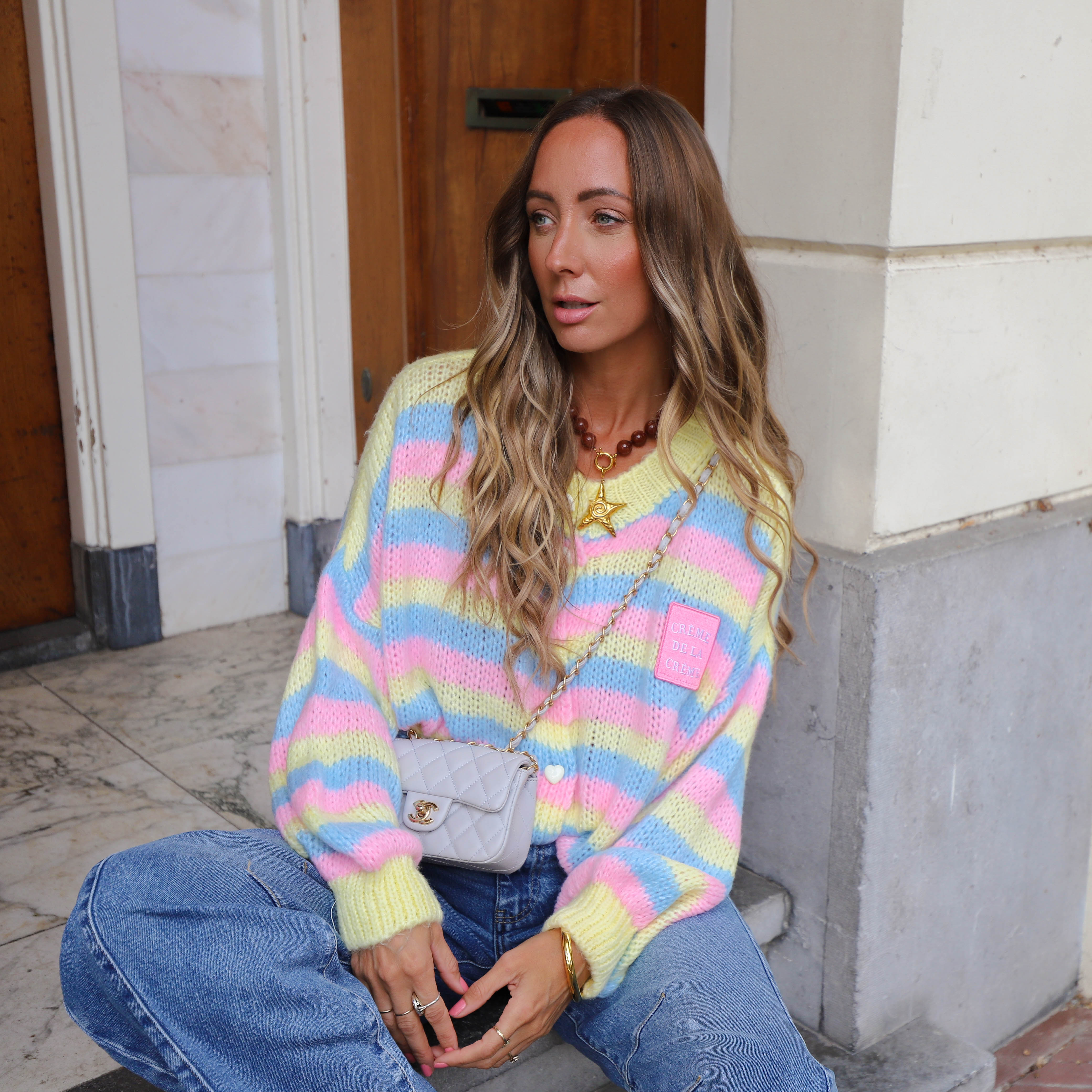 Geef je outfit een trendy twist met dit superzachte vest met strepen. Dit vest heeft een v-hals, lange mouwen met elastische manchetten en sluit met schattige hartvormige knoopjes aan de voorkant. Het vest is gemaakt van een zachte mix van materialen in pastelkleuren en heeft een opvallend label met de tekst 'Crème de la Crème'.