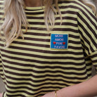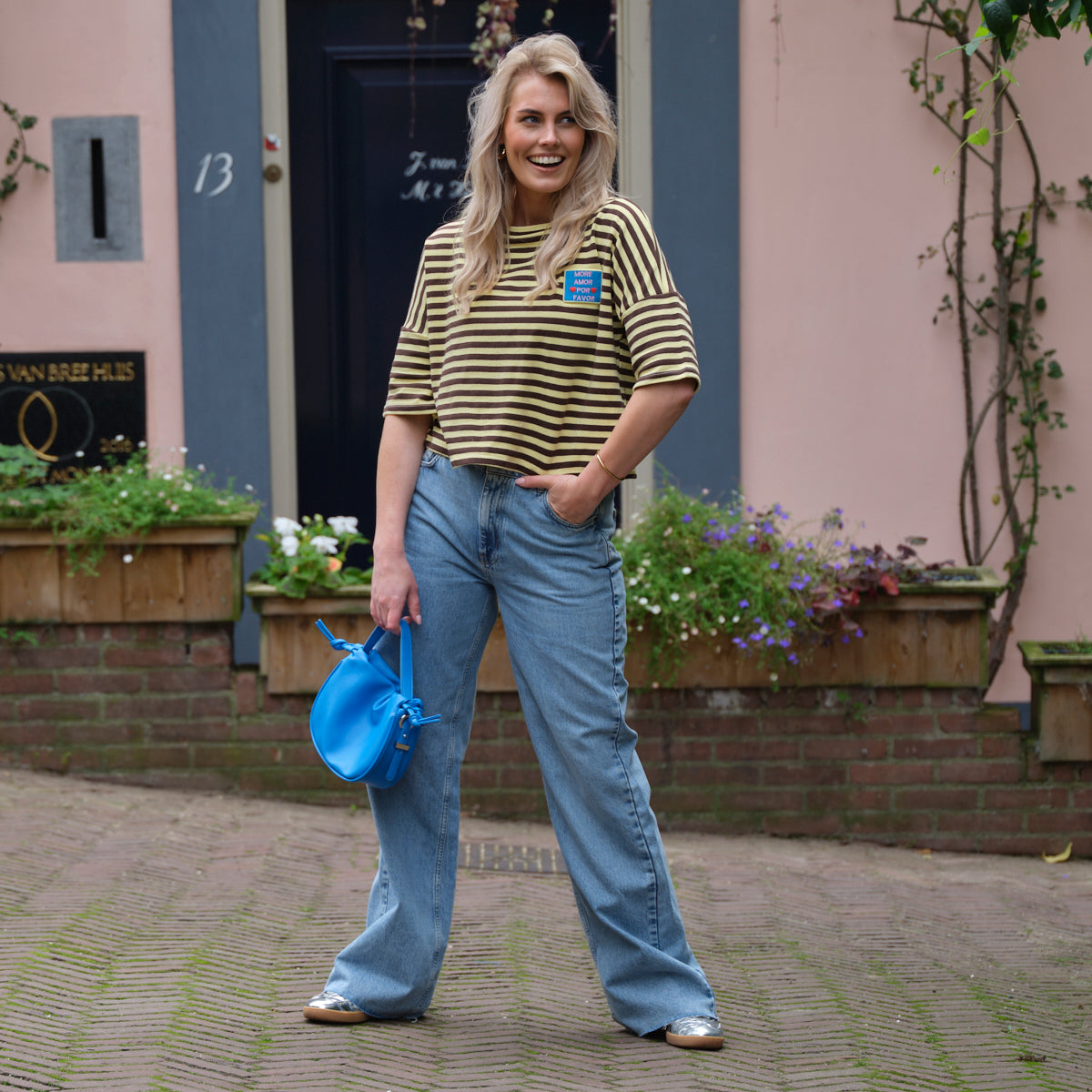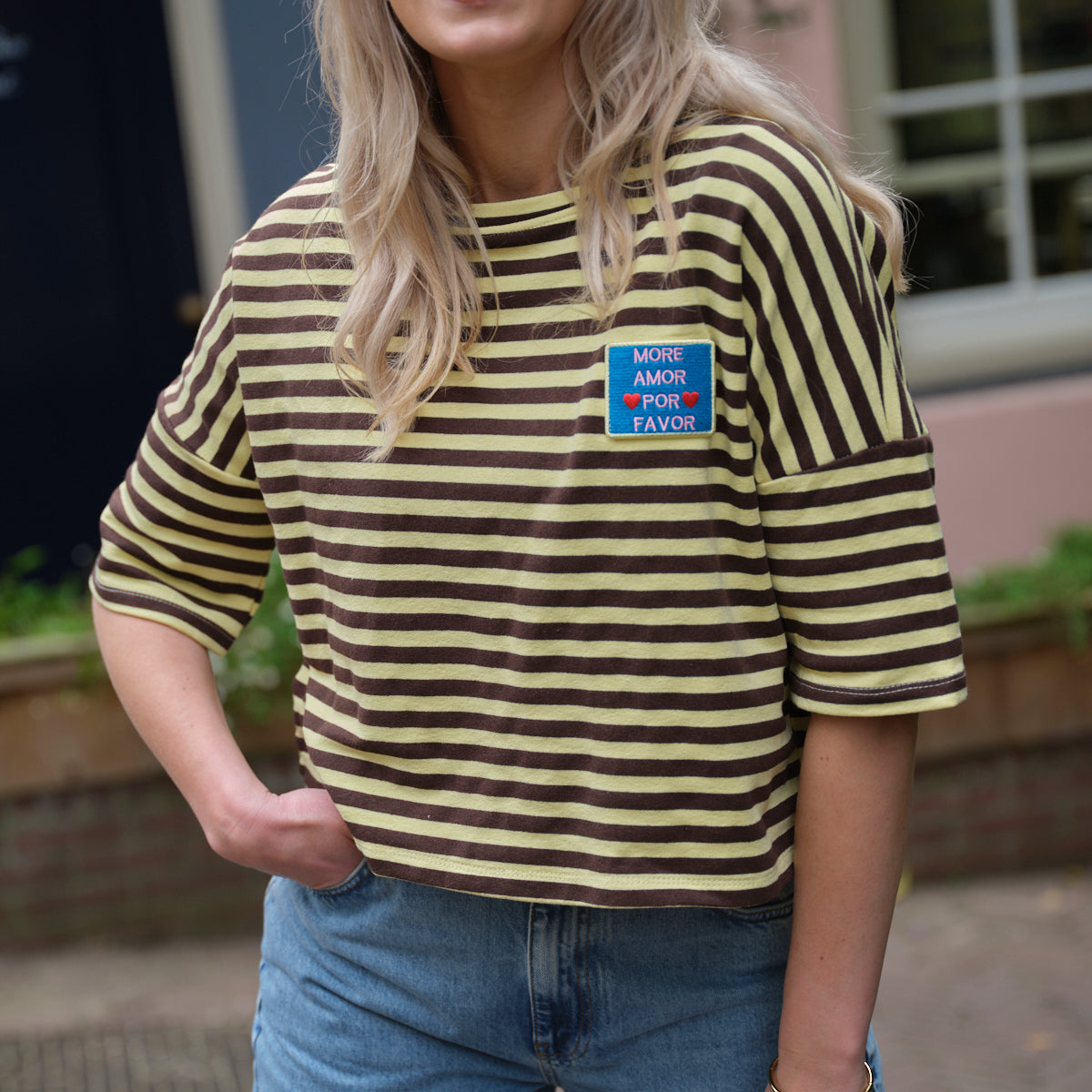 Deze Streep Top is een vrolijke, cropped essential met een speelse vibe. De top heeft een klassiek horizontaal streepdessin in een levendige combinatie van geel en bruin. De wijde, oversized pasvorm, de boothals en de driekwart mouwen zorgen voor een nonchalante look. De top heeft een klein, kleurrijk 'Mon Amour' patch op de borst als leuk detail.