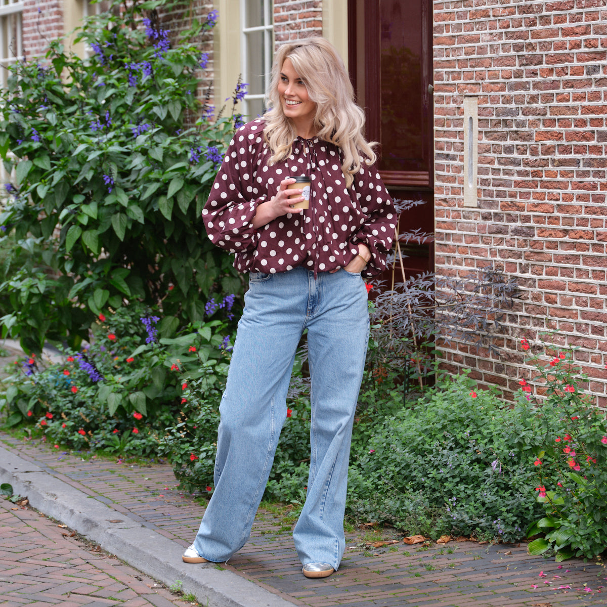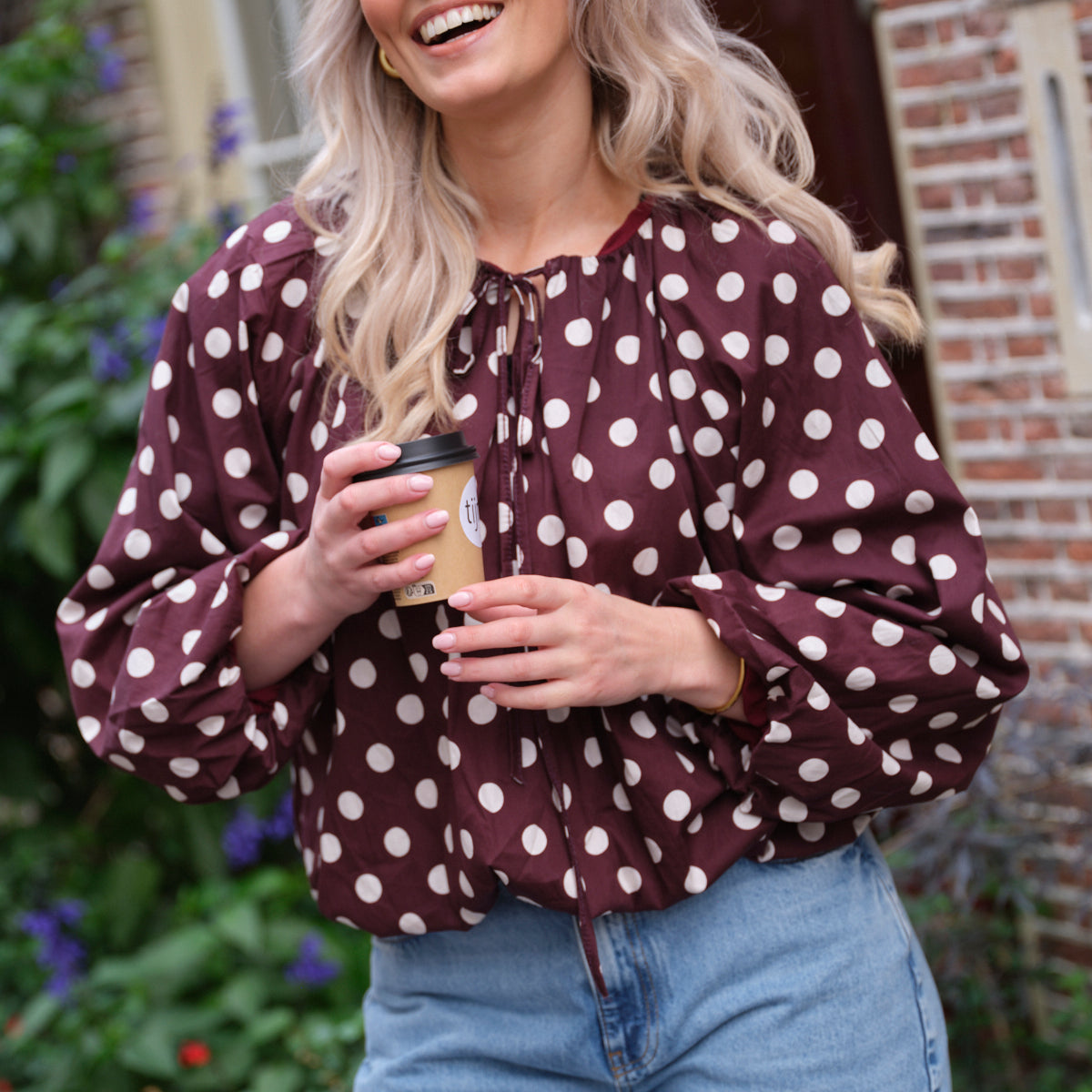 Deze Charlotte Top is een speelse en elegante blouse met een unieke pasvorm. De top is uitgevoerd in een diepe bordeauxrode kleur met een opvallend, all-over wit stippenpatroon. De soepelvallende stof, de wijd uitlopende mouwen en de elastische boord aan de onderkant geven de top een ballonachtig silhouet. De ronde halslijn met strikdetail maakt de vrouwelijke look compleet.